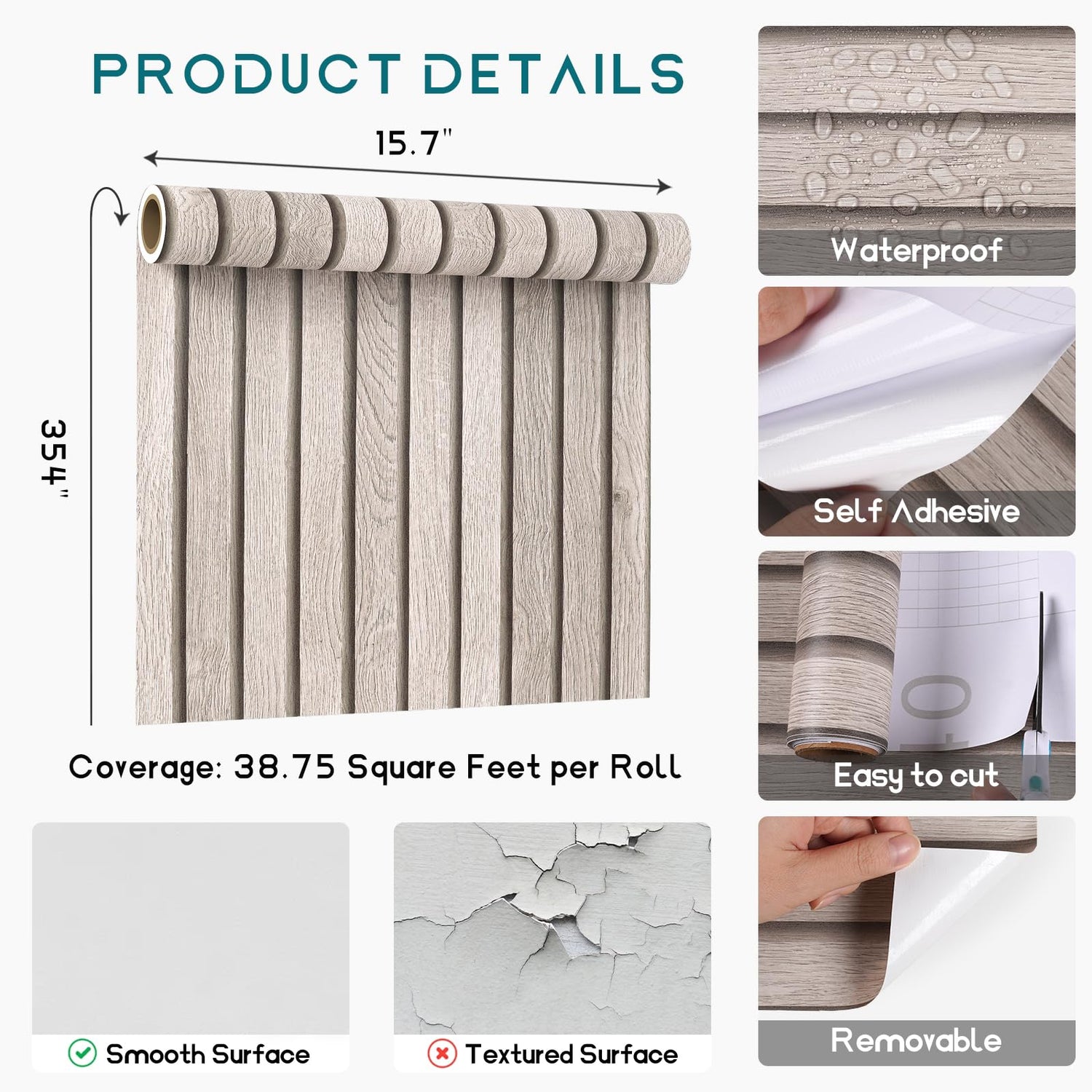 - ๐๐ซ๐จ๐๐ฎ๐๐ญ ๐๐๐ญ๐๐ข๐ฅ๐ฌ: Our wood slat contact paper is made of high quality vinyl, thick, durable, air bubble free, rustic grey wood panel design, 15.7'' wide by 354'' long, covers 38.7 Sq. Ft. each roll