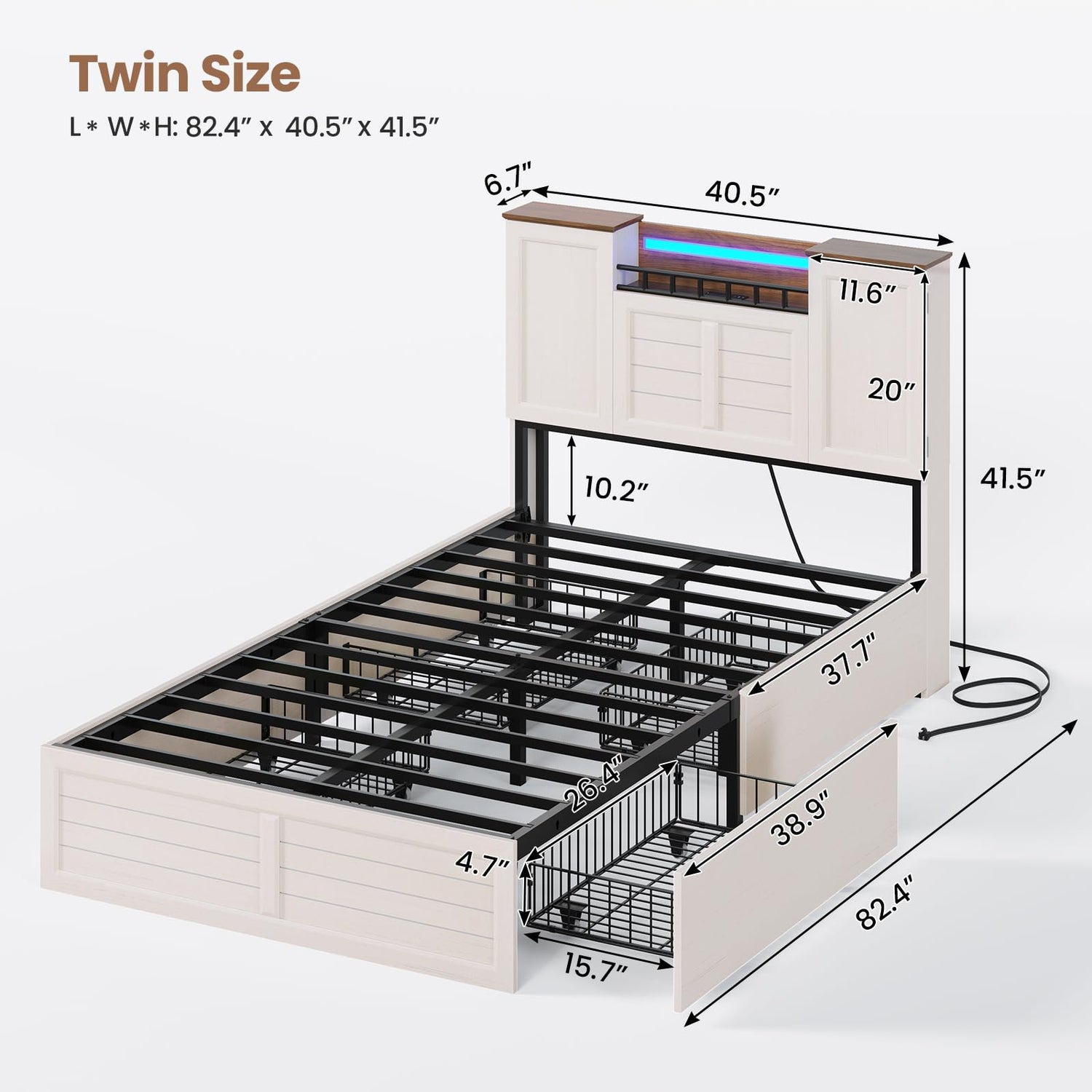 - 【Built-in Charging Station】Stay connected effortlessly! This twin bed frame with charging station includes 1 USB port, 1 fast-charging Type-C port, and 2 standard outlets, perfect for charging devices, lamps, or electronics without messy cords. The hidden cable management slot neatly routes wires out of sight.
