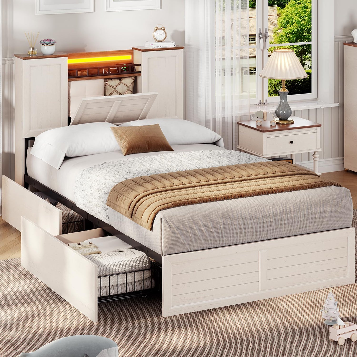 - 【Easy Assembly & Noise-Free】Designed for stress-free setup, this twin bed frame with storage arrives with pre-drilled holes, labeled parts, and a step-by-step visual guide. The reinforced wooden bed frame is secured with anti-shake bolts and padded with eva sponge, eliminating noise and rattles. The heavy duty twin bed frame with no box spring needed provide loading capacity up to 800lbs, and stays sturdy and durable through years of use.