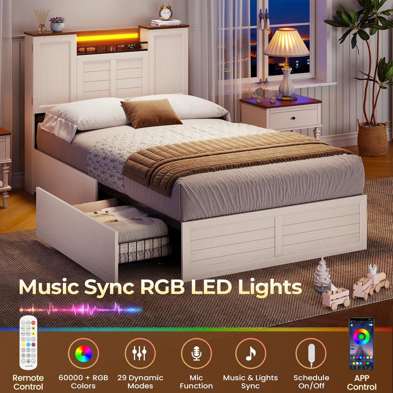 - 【Music Sync RGB LED Lights】Transform your bedroom into a dynamic sanctuary with premium RGB LED lighting that goes beyond ambiance! The sleek, built-in light strip offers 16 million+ color options and multiple brightness levels, controlled effortlessly via the included remote or phone app. Advanced sound sensors pick up music rhythms, making colors pulse and shift in real-time, perfect for movie nights, workouts, or unwinding.