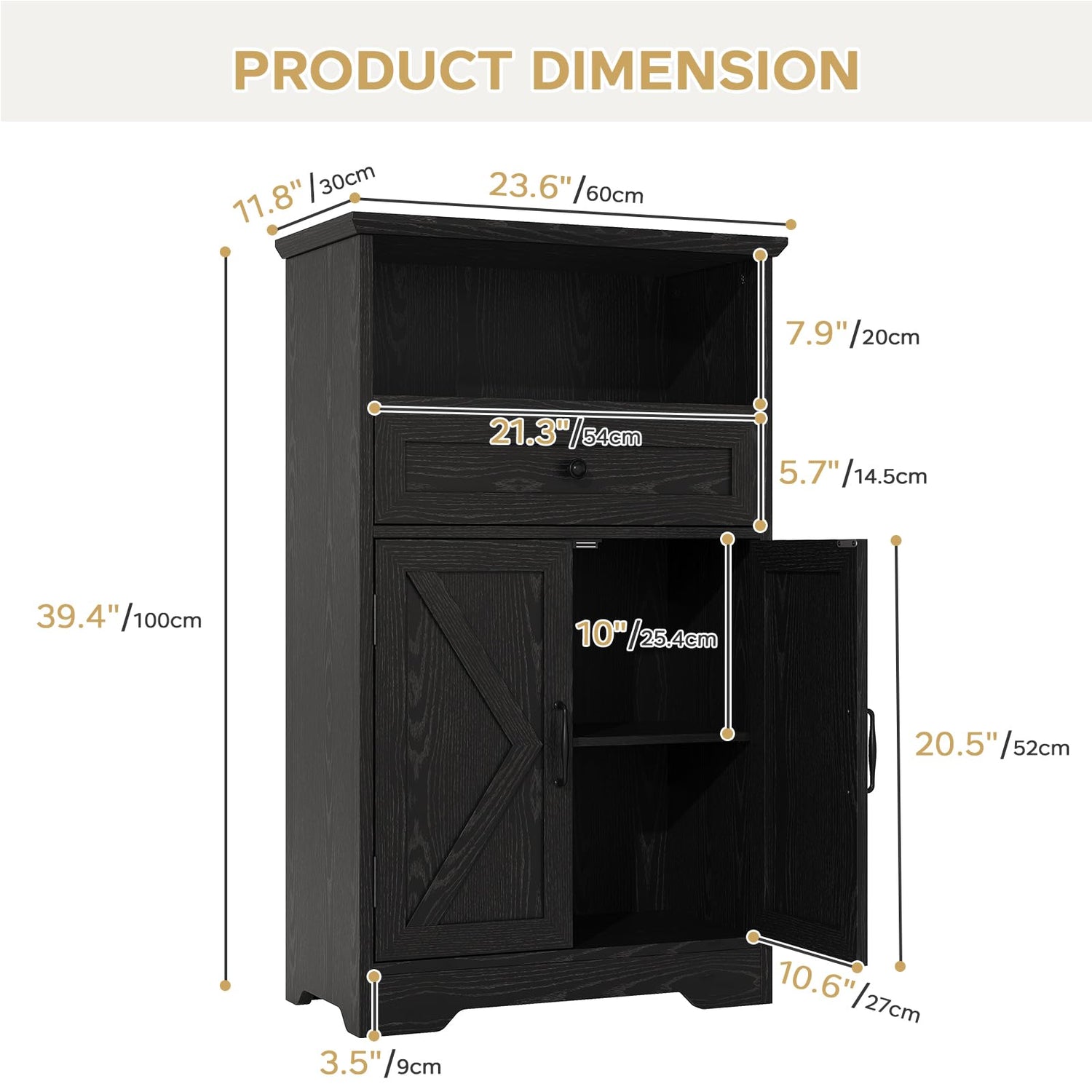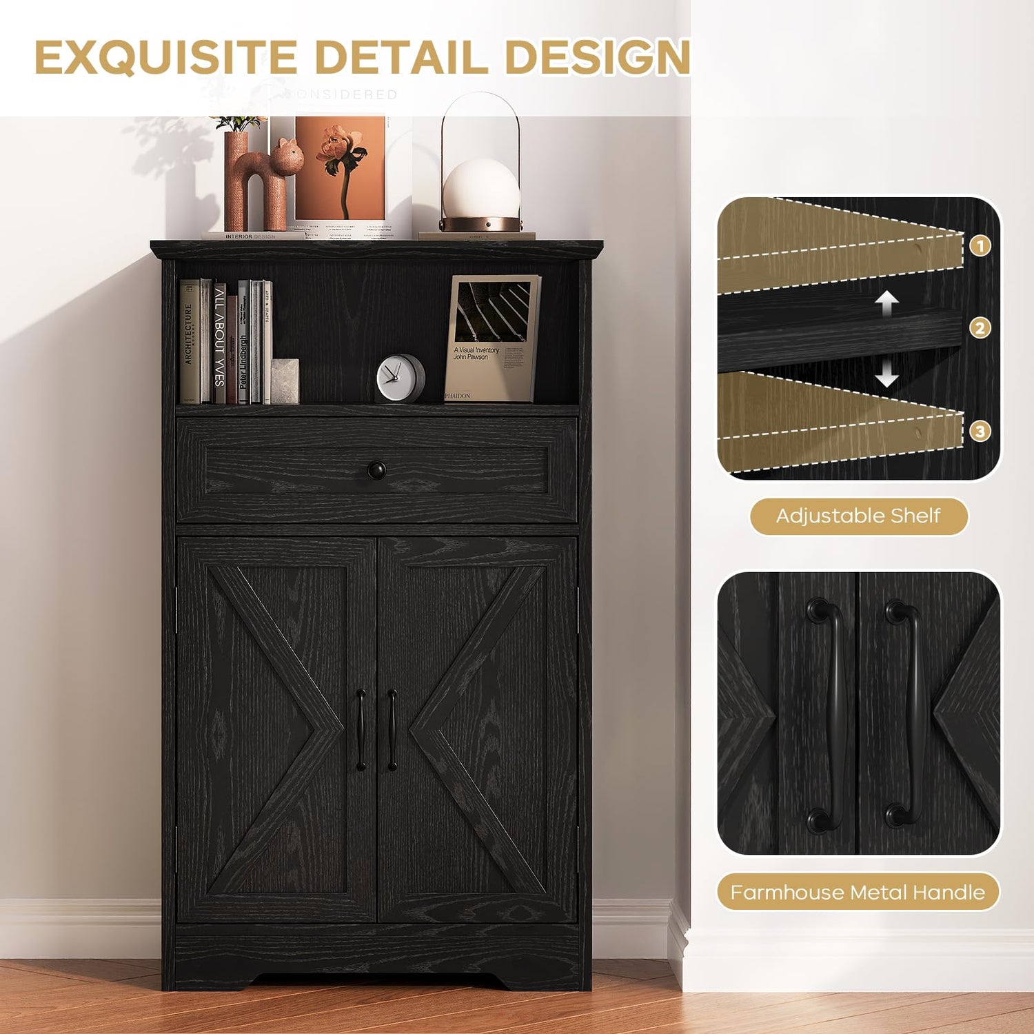 - FARMHOUSE STYLE: This classic barn doors storage cabinet combines rustic character with practical organization, featuring a functional drawer and timeless farmhouse styling. The structured design and minimalist hardware create instant charm while maximizing your storage space