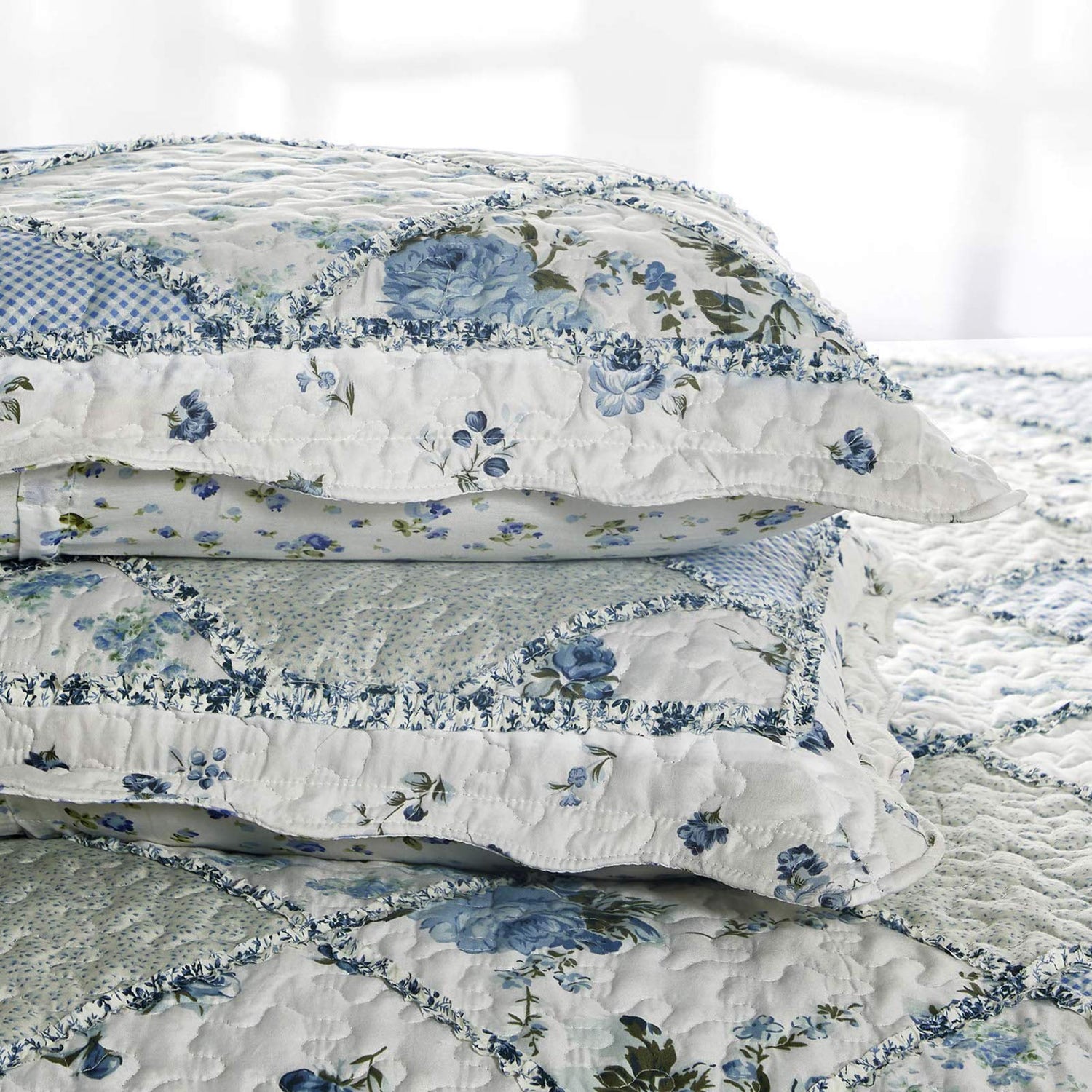 - 【Material】Shell:100% microfiber | Fill:100% microfiber. Using soft light fabric, comfortable and lightweight bedspread set, perfect for all year round. This queen size blue floral patchwork quilt set is reversible, both sides could be used individually. Coverlet set Includes: 1 Bedspread + 2 Pillow Cases.