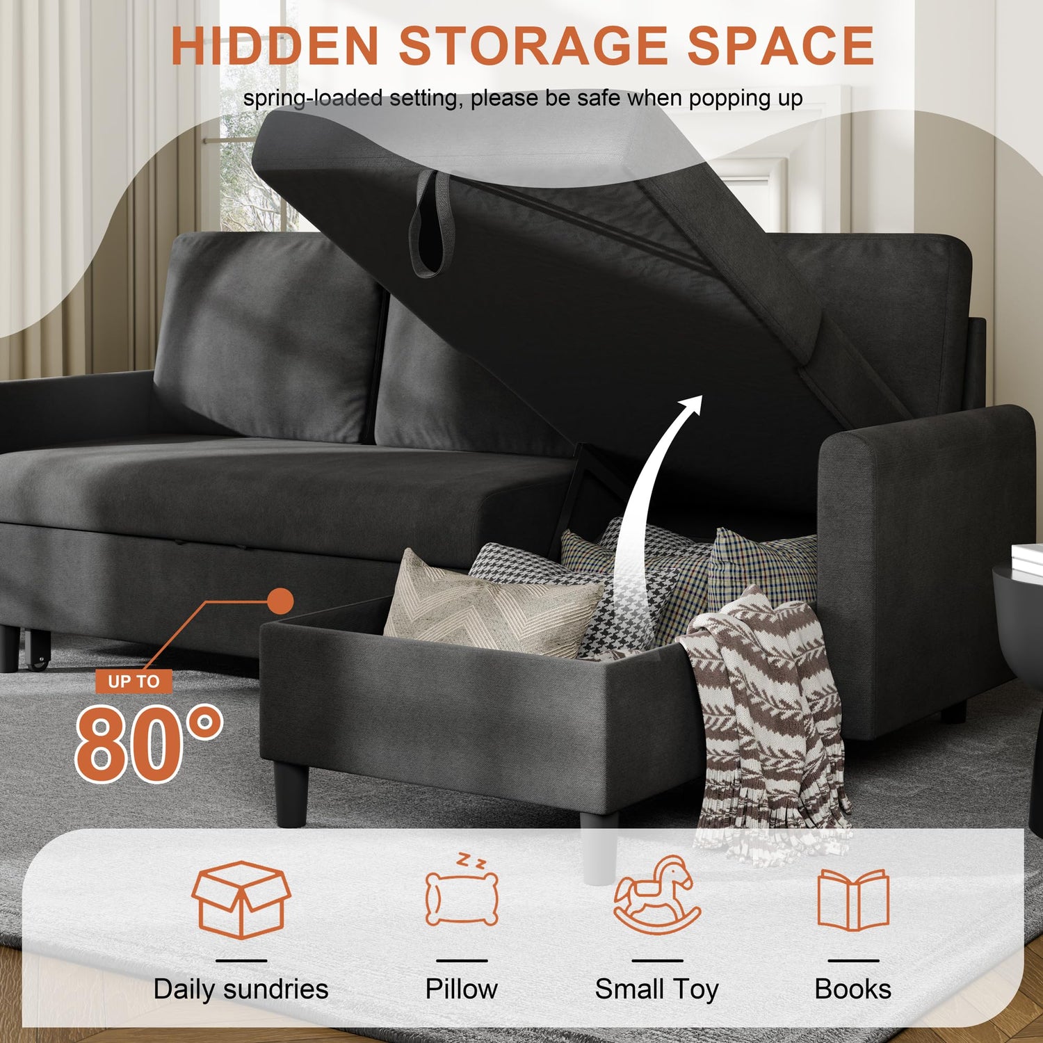 - Hidden Storage Space: The built-in storage compartment is easily accessible and roomy, perfect for stashing blankets, pillows, or other items, helping you save space while keeping comfort within reach.