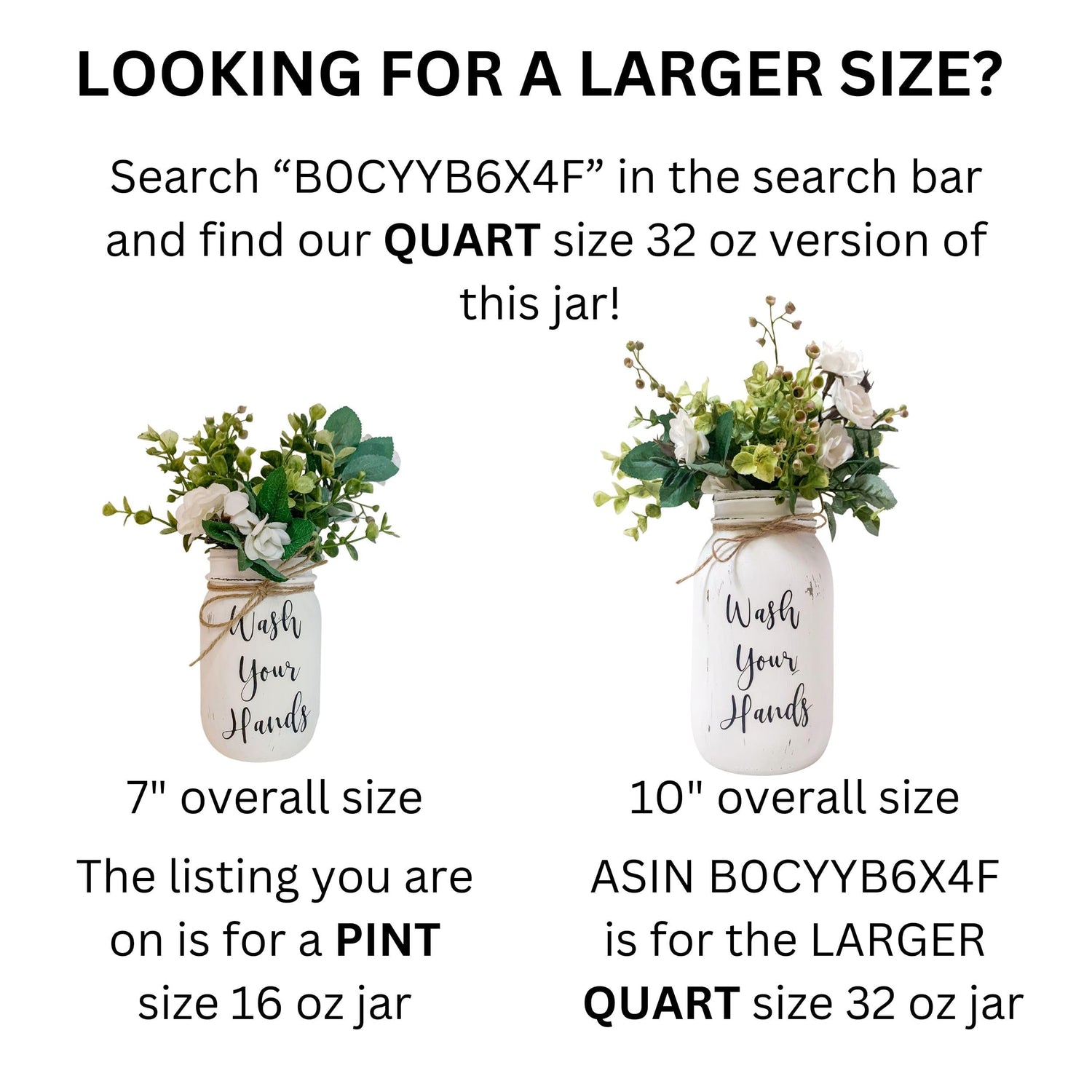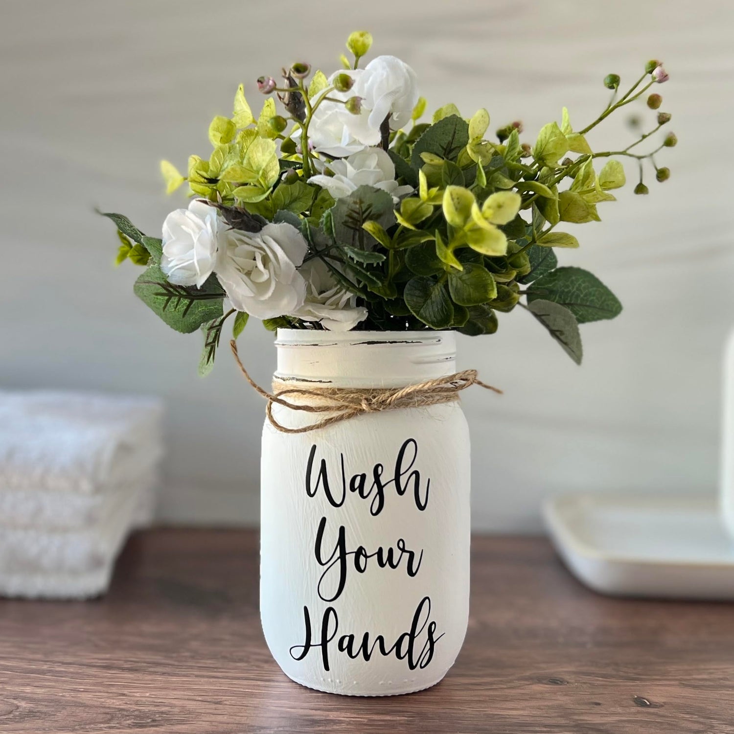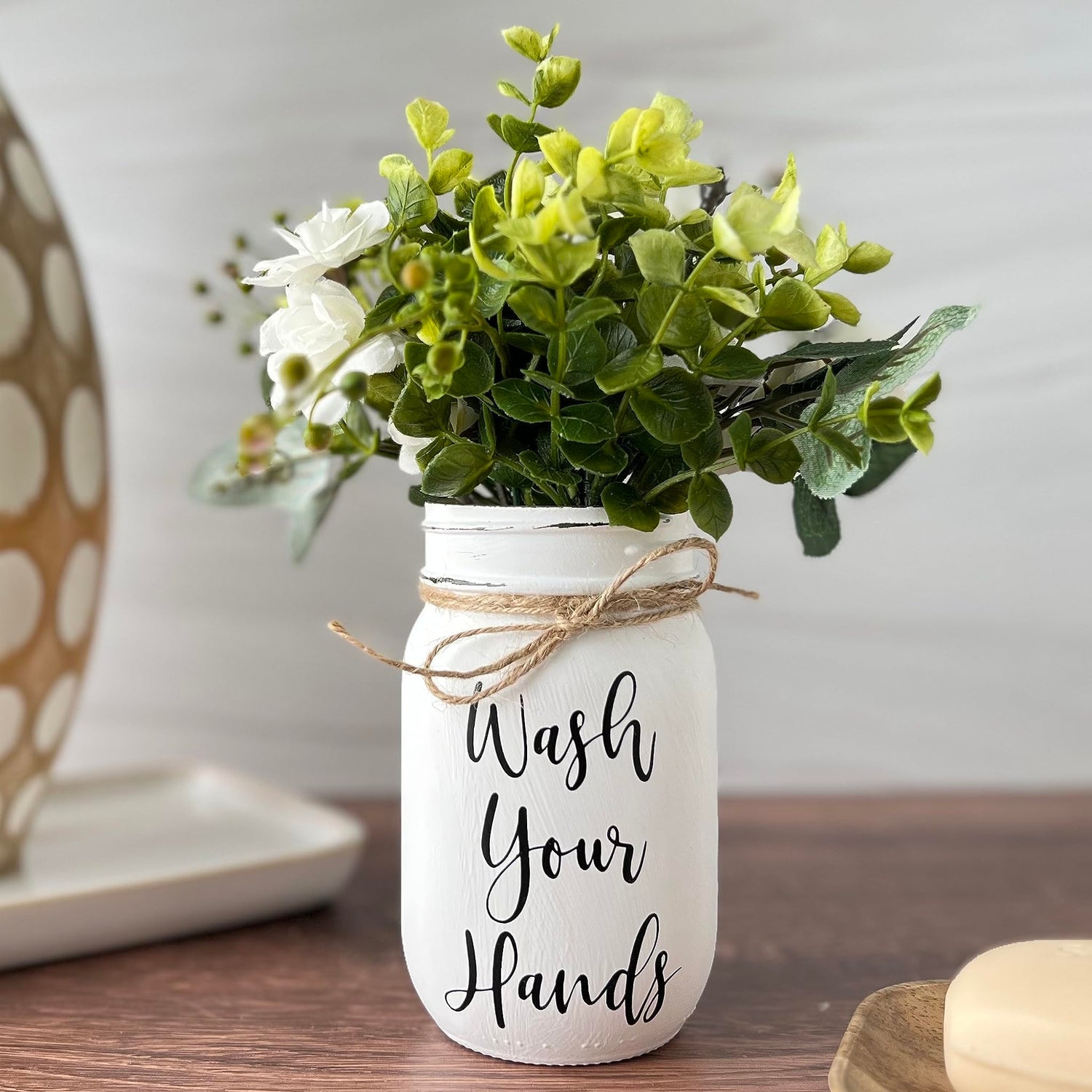 Wash Your Hands Mason Jar, Hand Painted and Distressed Mason Jar Decor, Pint 16 oz. Regular Mouth, Artificial Flower Arrangement for Bathroom, Rustic Farmhouse Bathroom Decor for Shelf