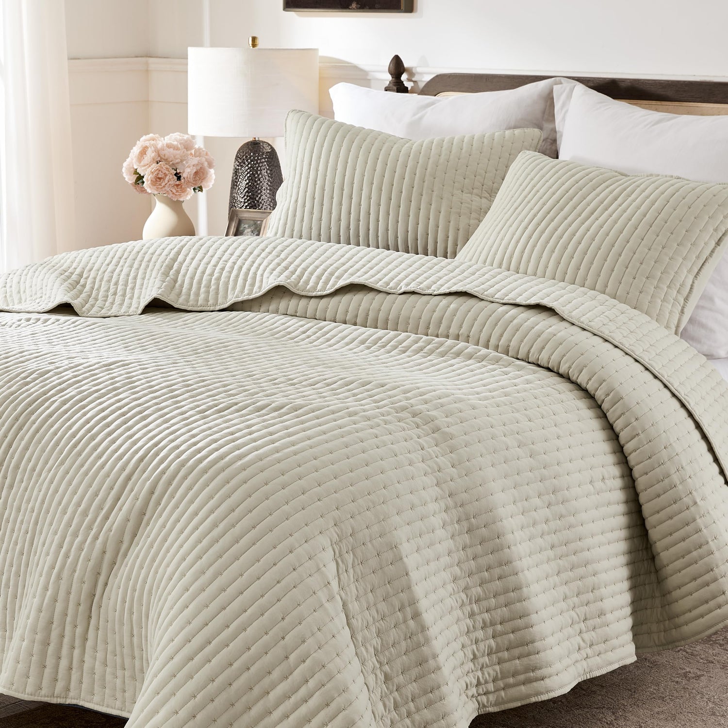WDCOZY Beige Cross Stitch Queen Size Quilt Set, Netural Striped Lightweight Soft Bedspread, Channel Farmhouse Rustic Coverlet, All Season Country Bedding, Thin Comforter