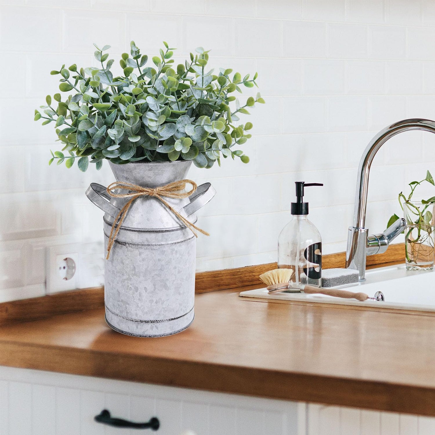 • Material: Lifelike eucalyptus bushes are made of plastic. The milk tin is made of galvanized metal, accented with simple jute twine bow. It's lightweight for easy display and sturdy enough to support the plants. This faux eucalyptus centerpiece combines vintage appeal with long-lastig beauty. No watering or additional maintenance is required, and it will always add a vibrant atmosphere to your space.