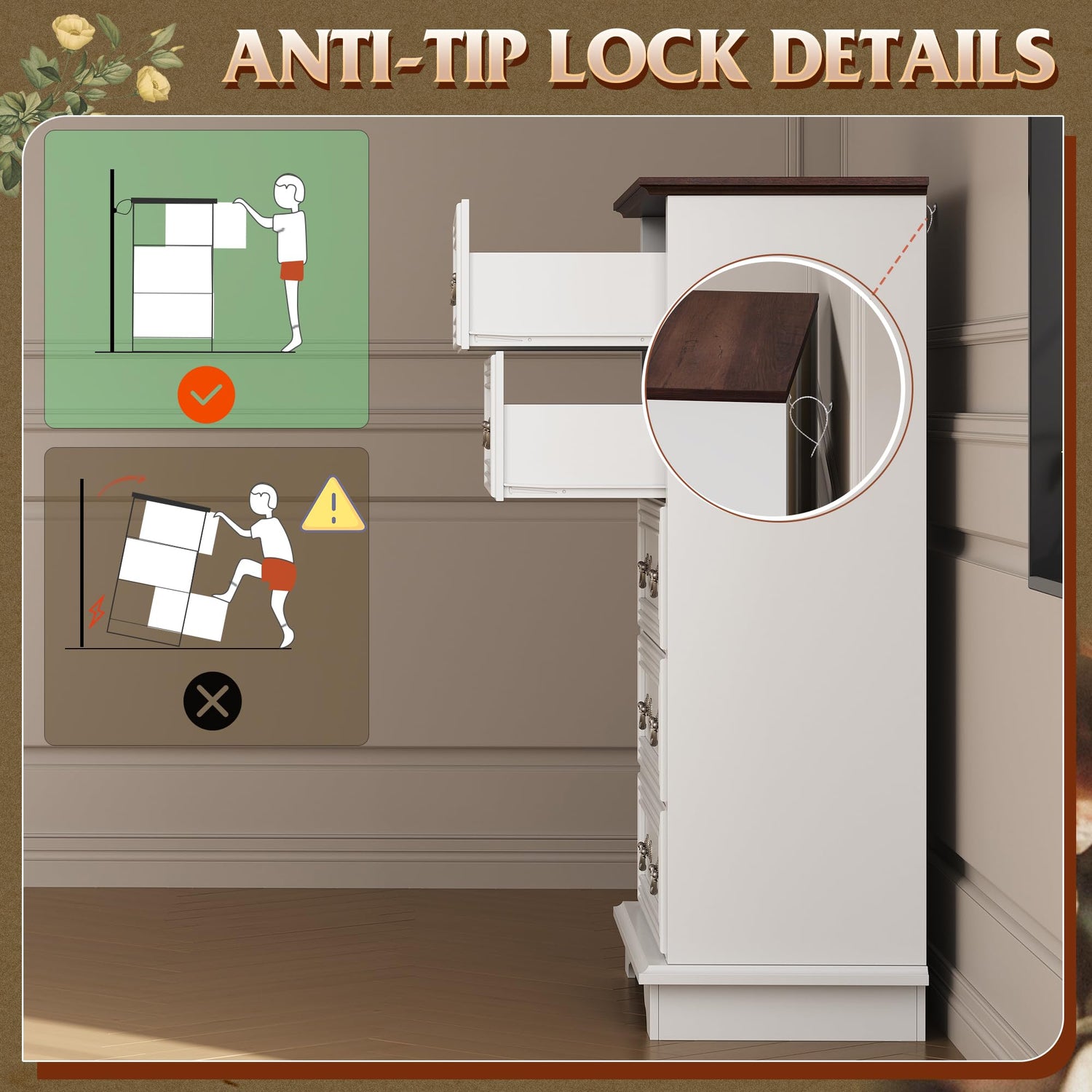 - 【Safe and Sturdy】The dressers & chests of drawers are made of durable engineered wood, featuring a thick tabletop that can support heavy items. Sloping edges and widened legs improve stability. An anti-tipping device ensures child safety by preventing wobbling and tipping.