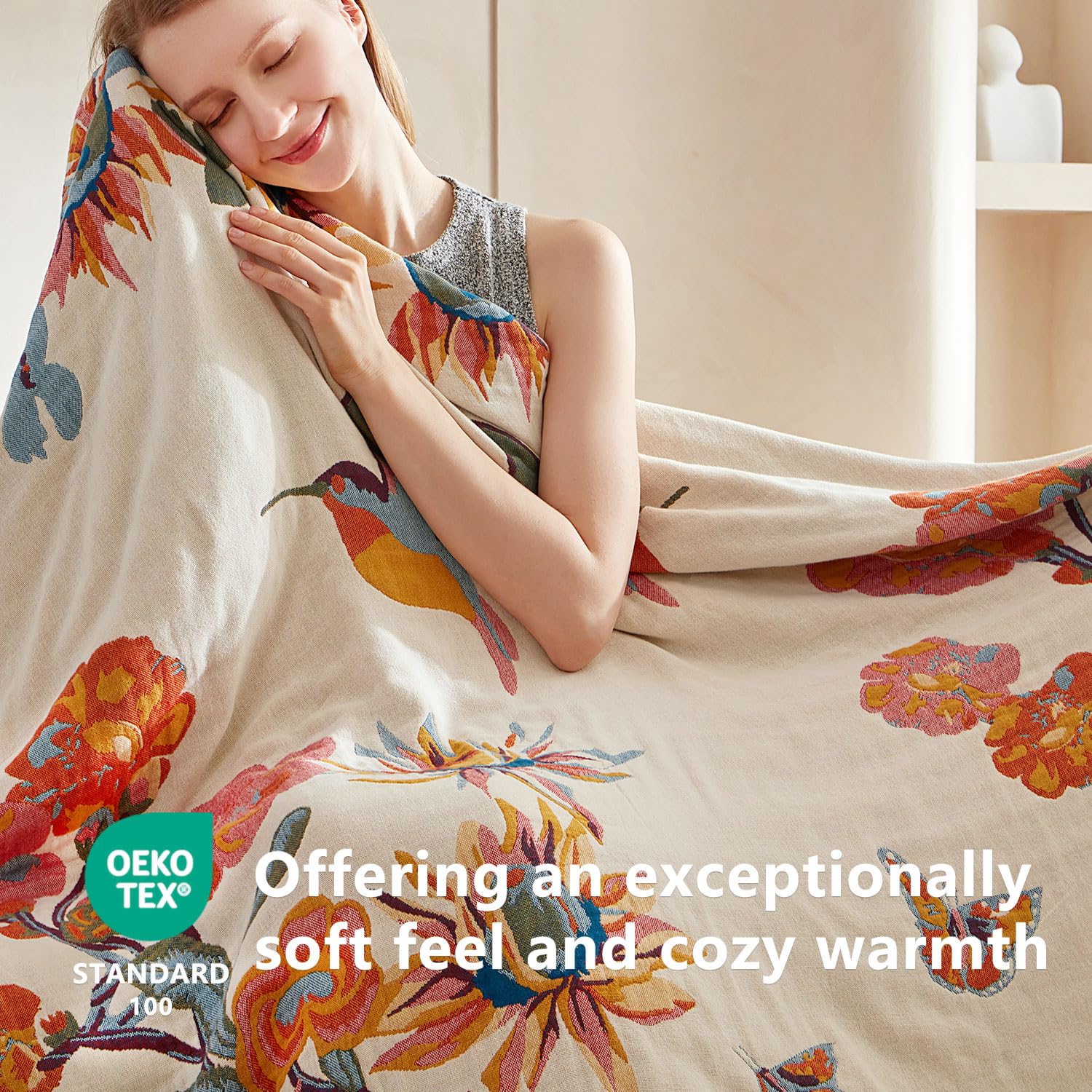 - 100% Premium Cotton: Crafted from 100% high-quality cotton, this boho throw blanket is incredibly soft against your skin and offers exceptional breathability. Perfect for hot sleepers or year-round use, it provides cozy warmth without the heaviness of traditional blankets. The four-layer gauze weave ensures durability while maintaining a fluid, drapeable feel