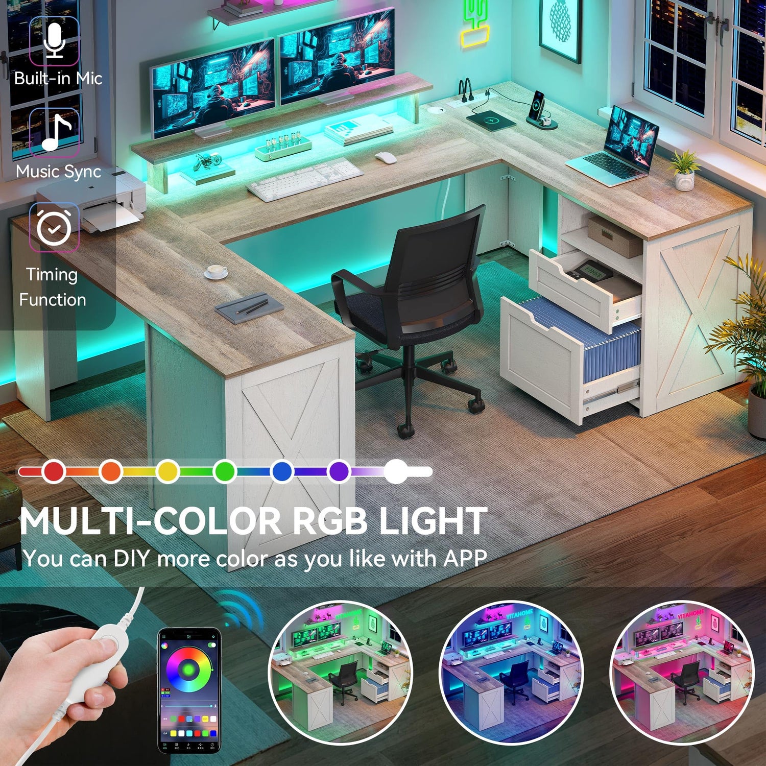 YITAHOME U Shaped Desk with Power Outlet & LED Lights, Farmhouse Computer Desk with Drawers, Wood Desk Home Office Desk with Monitor Stand & 5 Cubbies Storage Shelves, Grey Wash