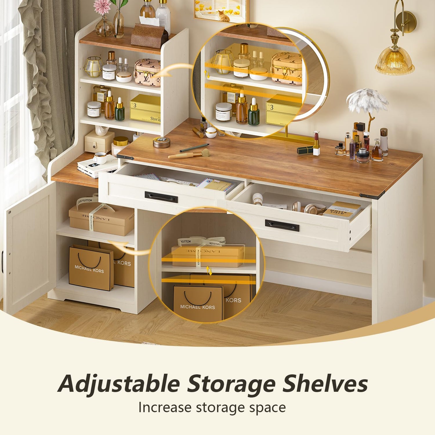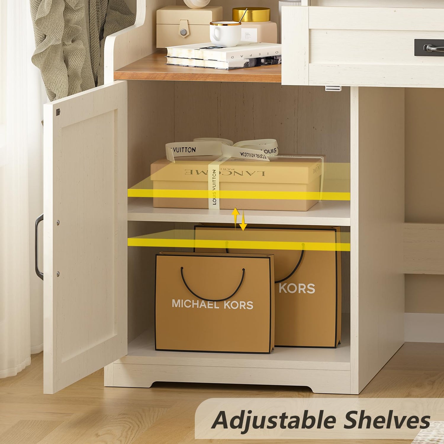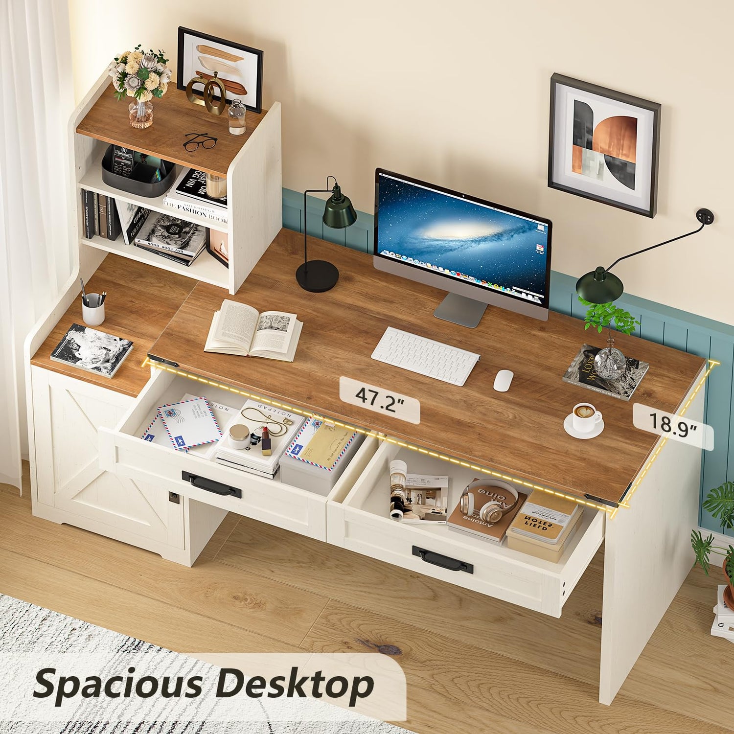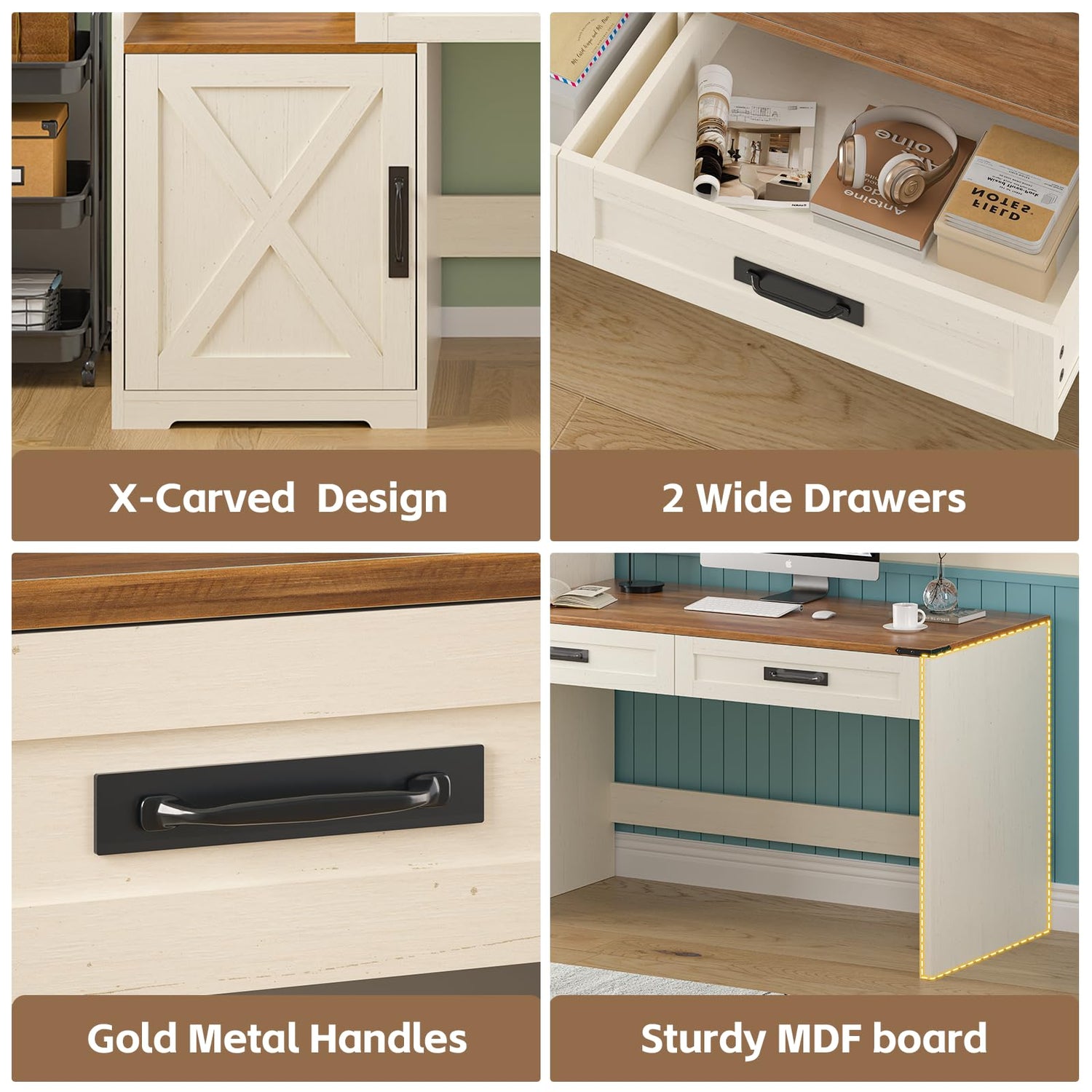 YOMILUVE 60'' Farmhouse Computer Desk with Drawers, Home Office Desk with Bookcase, Vanity Desk Writing Study Table with Storage, Antique White