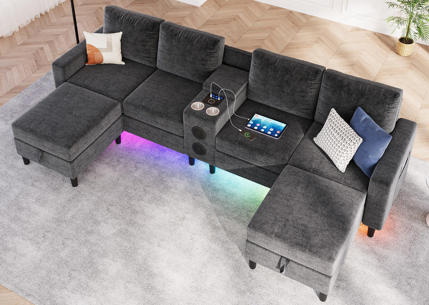 ZSDT Sectional Couches for Living Room, 6 Seat Sectional Sofa Smart Module-Bluetooth Speaker/RGB Light/Charging Station, Chenille U Shaped Couch with 2 Movable Storage Ottomans (Dark Grey)
