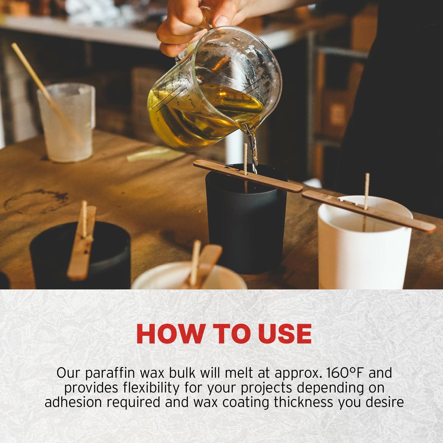 - How to Use: Our paraffin candle wax for candle making will melt at approx. 160°F and provides flexibility for your projects depending on adhesion required and wax coating thickness you desire