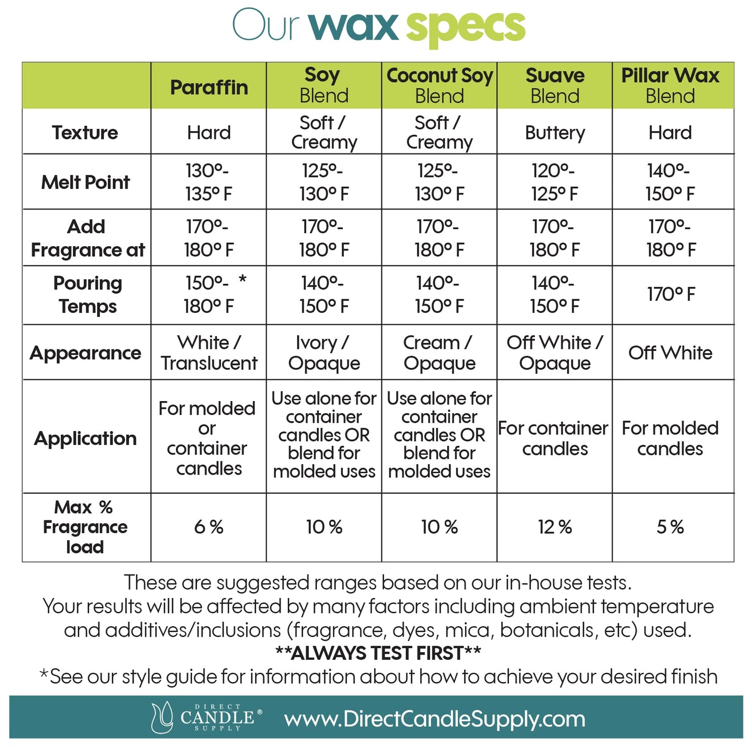 - Coconut Soy Wax: Our waxes are designed for a long and clean burn. Our wax blend for candle making is made of high quality coconut wax, soy wax, and small amounts of paraffin. Because of the blend's nature, color may vary between off white and beige.