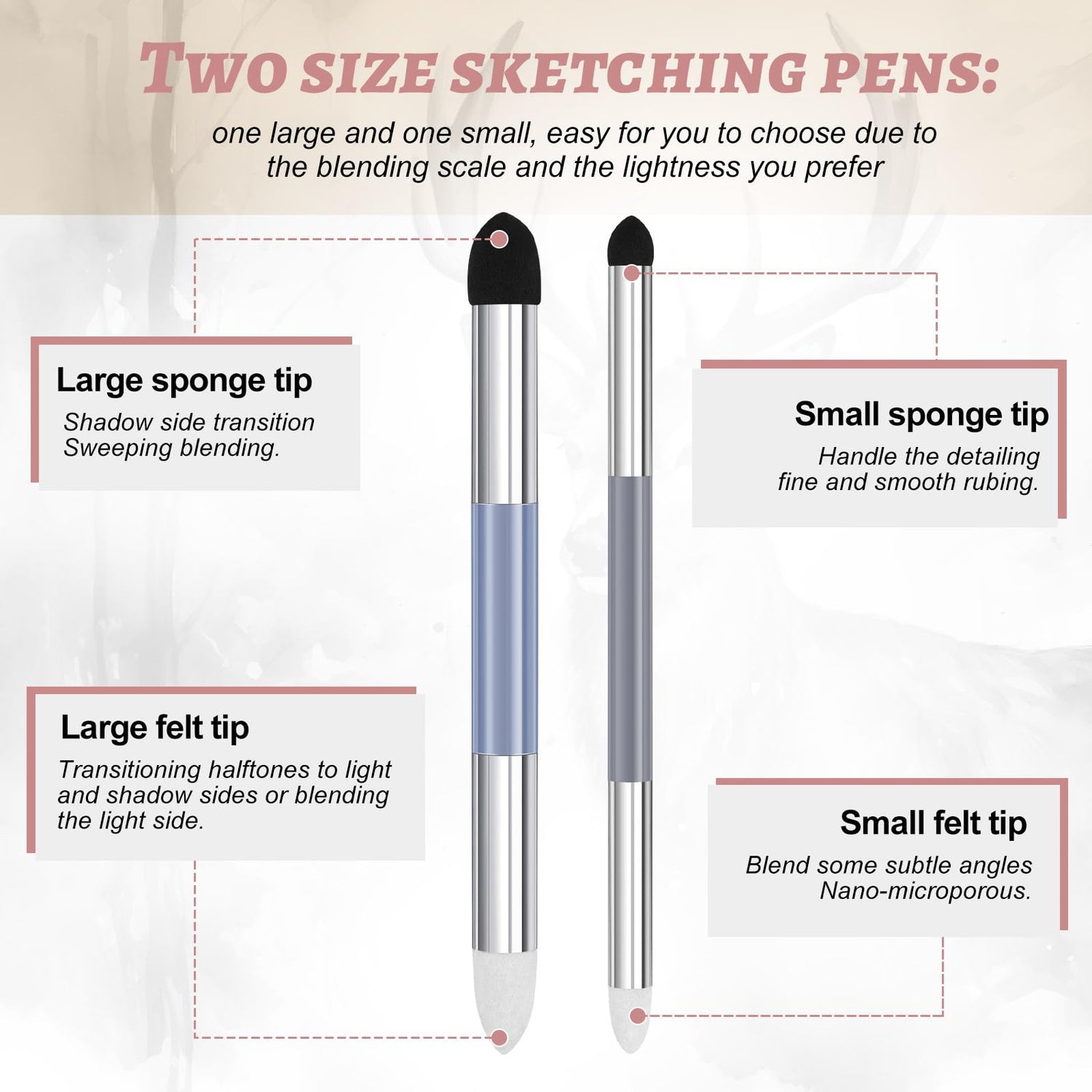 - Practical Dual Head Design: the black nib of the large pen in these sketch blending sponge pens can be applied for shadow side transition, suitable for preliminary blending, and the white nib is suitable for transitioning halftones to light and shadow sides or blending light sides; The black nib of the small pen can be applied to handle details, making your sketch more dynamic and visually attractive, and you can use the white nib of the small pen on the detail side