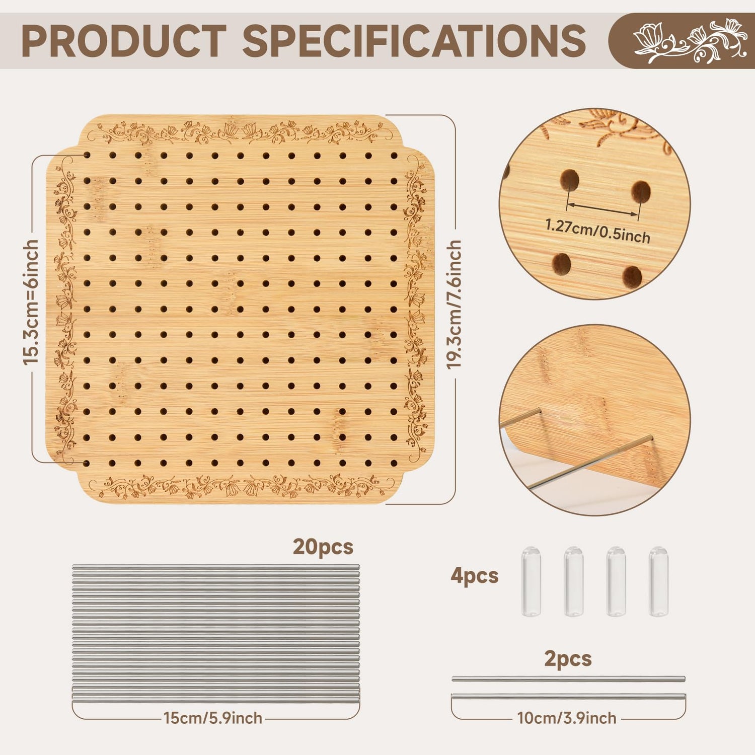 - Beginner-friendly crochet blocking board with pins: The crochet blocking board measures 7.6 x 7.6 inches. There are 13 holes in each row and a total of 169 holes. Our knitted loom comes with 20 5.9-inch and 2 3.9-inch stainless steel pins,4 caps, and a storage bag for steel pegs and caps. The hook and needle loom comes with the pins fit into the holes, and the corners are cut for convenient use