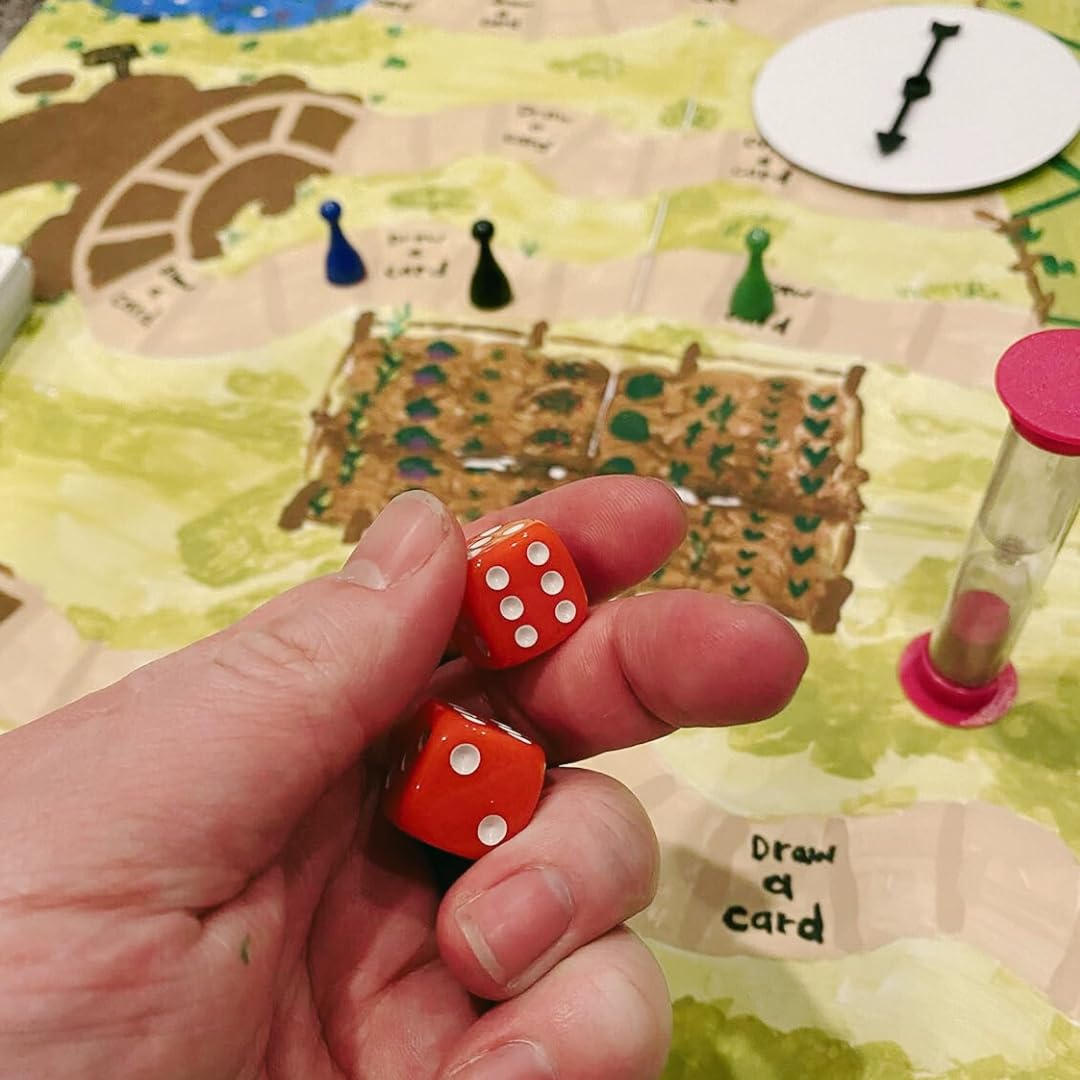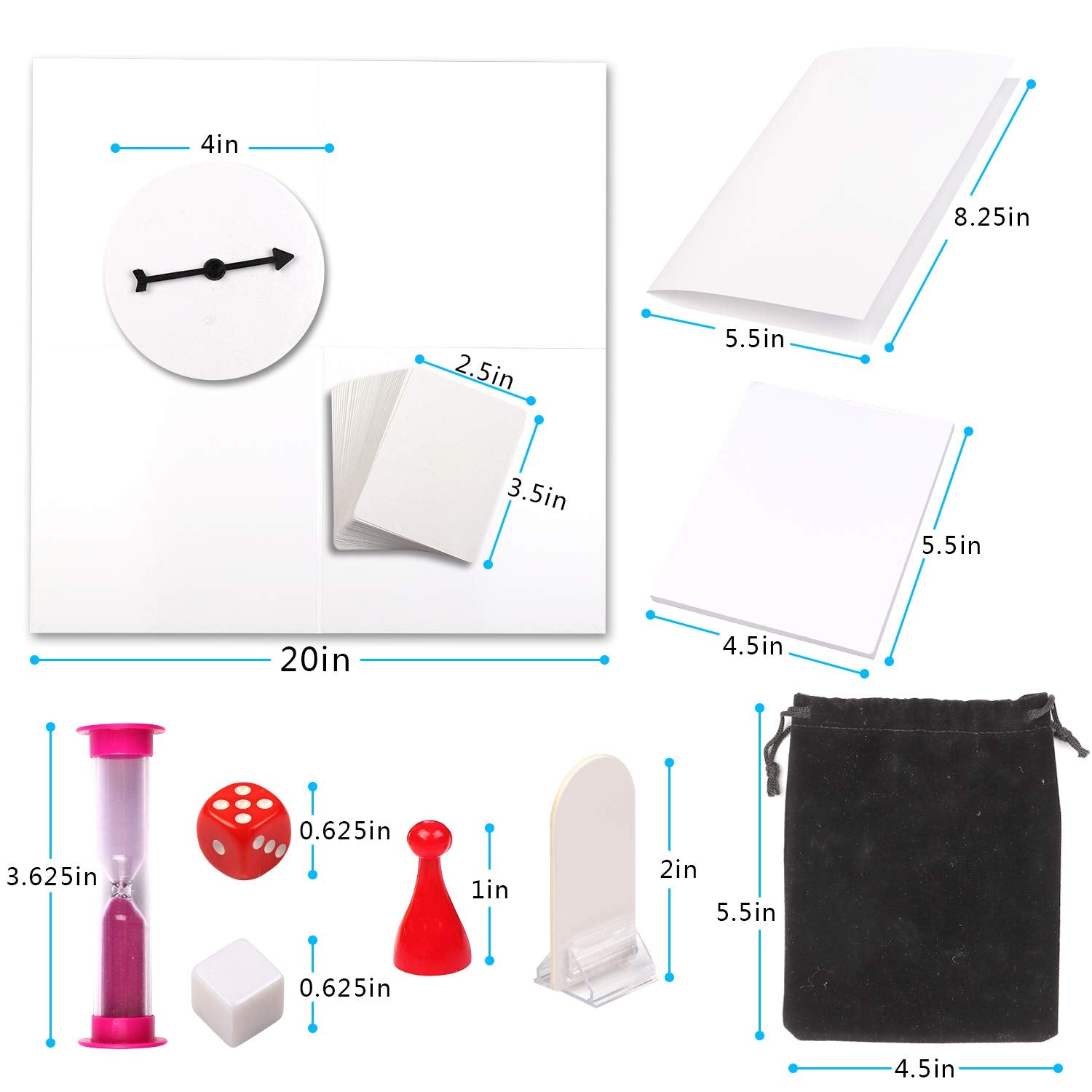 - Everything You Need: 116 blank playing cards, One blank 20" X 20" double-sided folding game board, One storage box, One blank spinner, Four blank dice, Two Six-sided dice, One 50-page notepad, One blank sheet for rules or game instructions, One 60-second timer, Six colored pawn pieces, One drawstring bag, Eight blank player pieces with stands