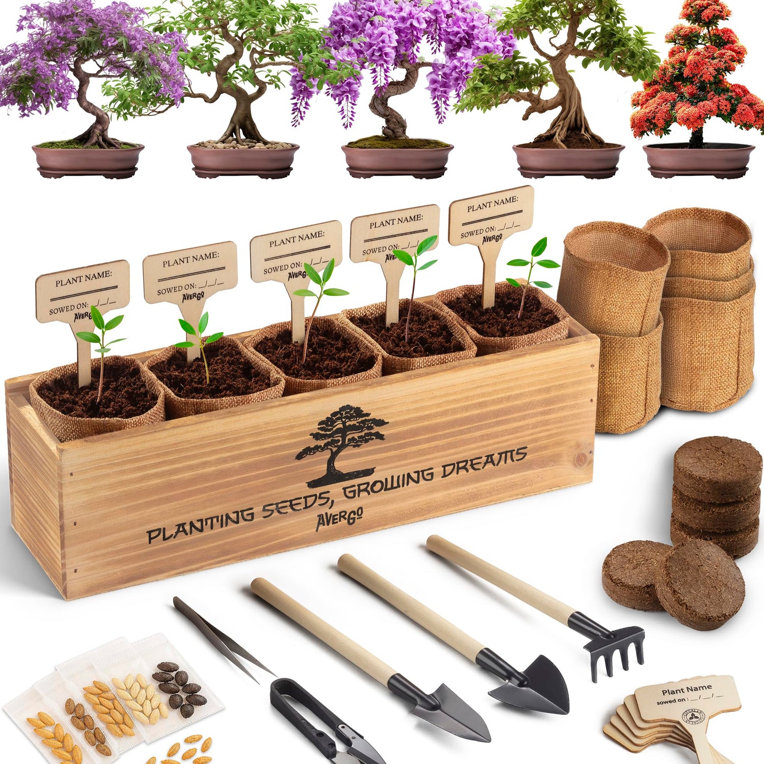AVERGO Bonsai Tree Kit for Beginners – 5X Unique Japanese Bonzai Trees | Complete Indoor Starter Kit for Growing Plants with Bonsai Seeds, Tools & Planters – Gardening Gifts for Women & Men