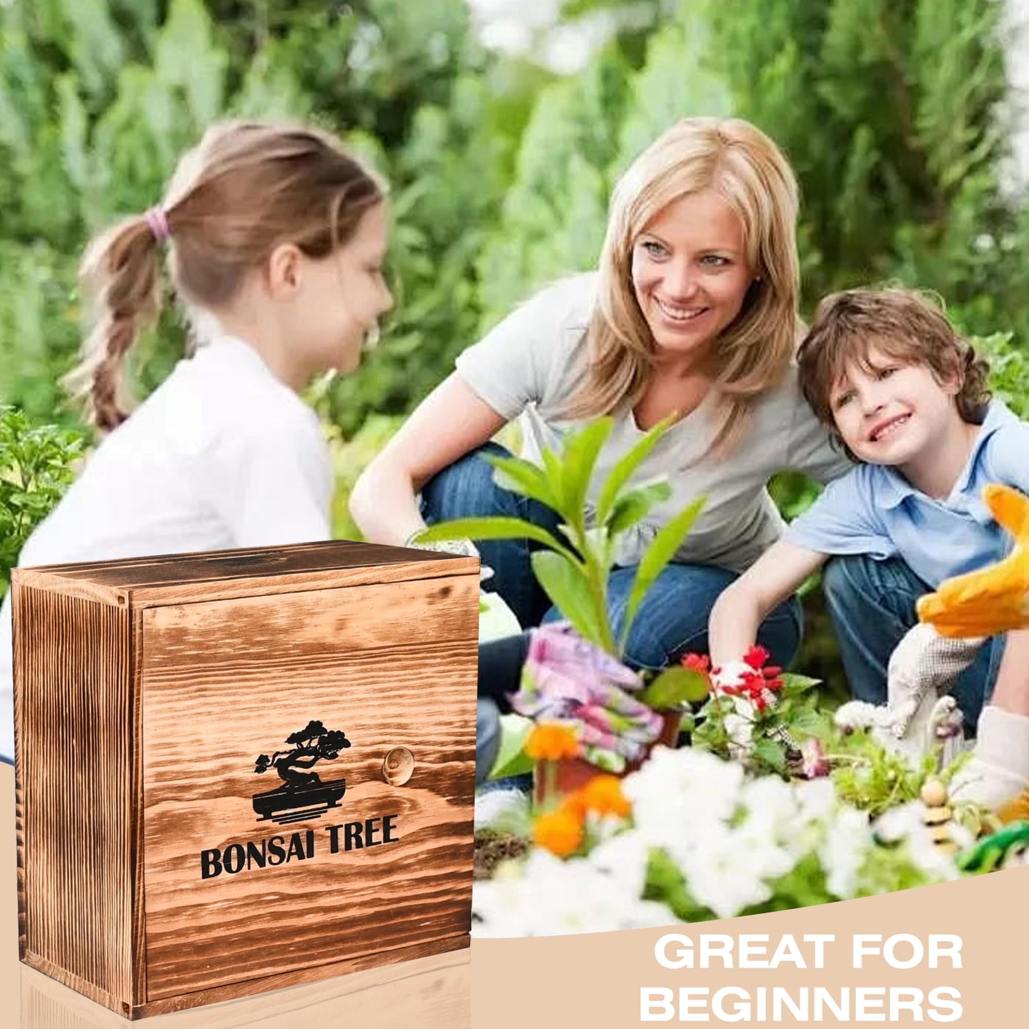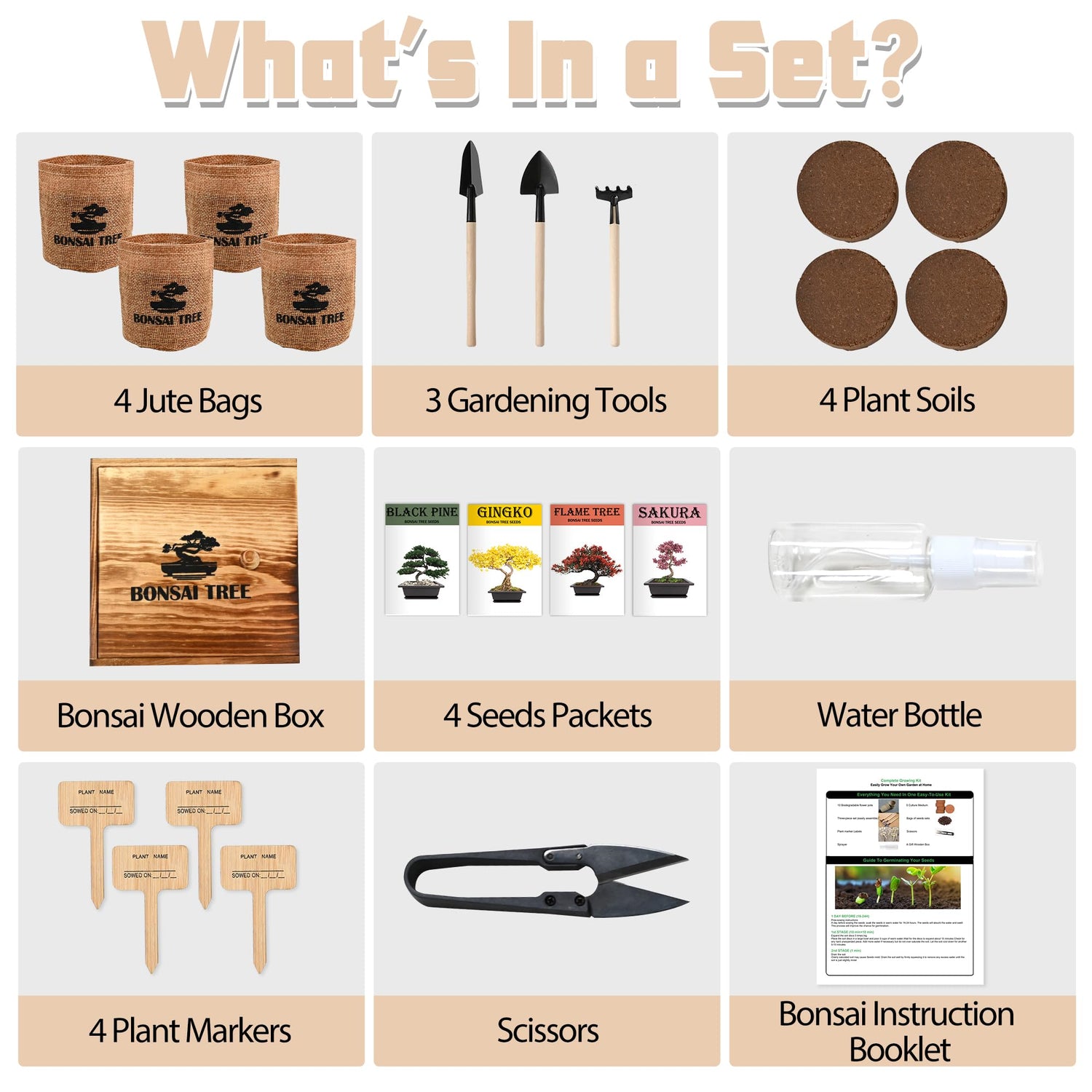 - KIT INCLUDES: 4 types of bonsai tree seeds, 4 jute bags, 4 soil discs, 4 writable plant markers, 3 mini gardening tools, 1 bonsai pruner, 1 small water bottle, 1 wooden box with cover and a gardening guide