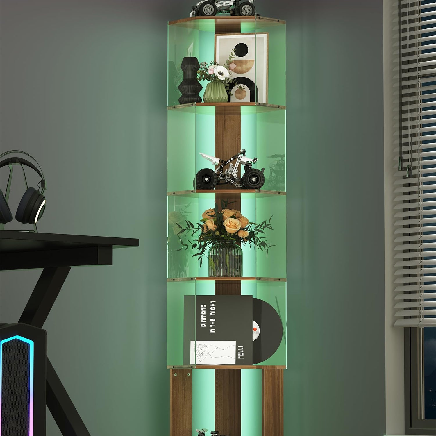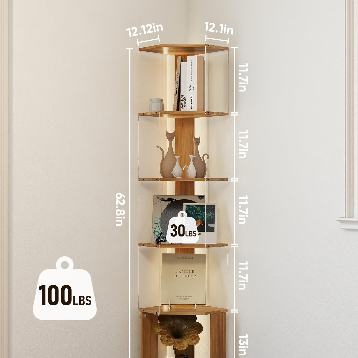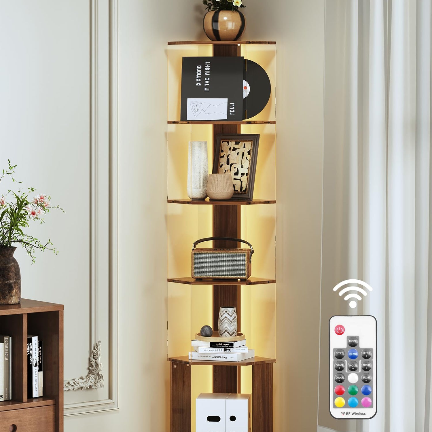 • 6 Tier Corner Shelf: This 6 tier corner display cabinet is made of high quality wood lumber and acrylic, the distance between each tier is 11.7 inches, and each tier can hold at least 15 pounds or more. The corner shelf with light is perfect for the corner of any room, maximizing your floor space providing ample storage or display space, the 6 tier curio cabinet has plenty of storage space, you can not only use it for storage, but also you can use corner shelves for displaying photos, books, handicrafts and other decorative items,corner lamp with shelves giving your room a unique display effect, enhancing the beauty and personalization of your room.