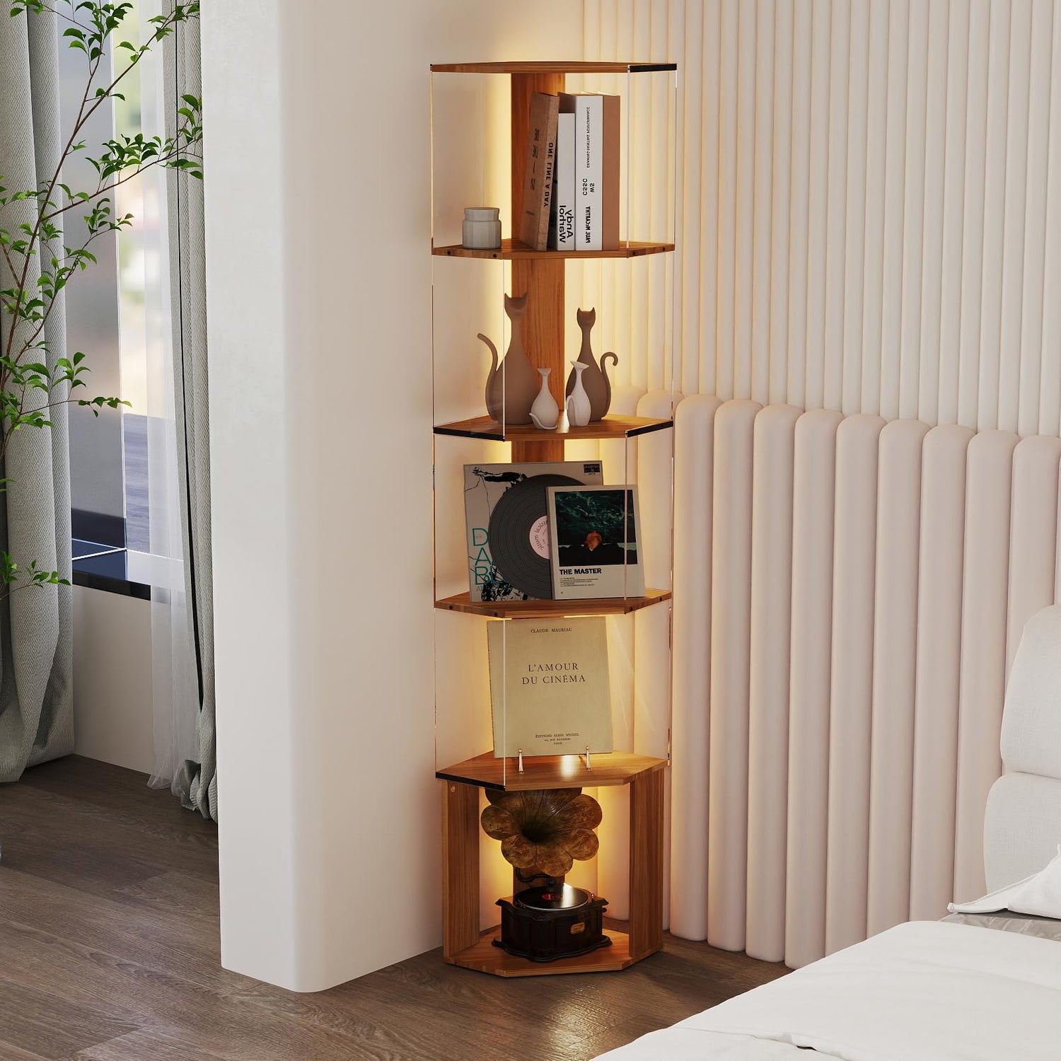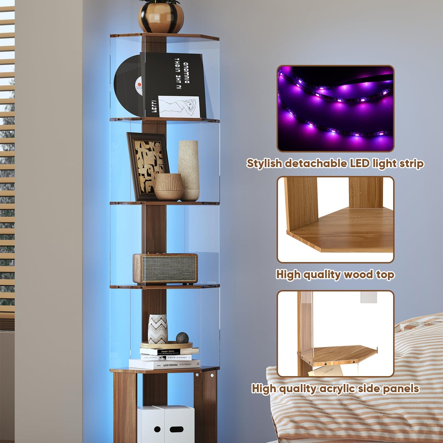 • Multi-functional Corner Display Cabinet: This corner ladder shelf is designed for seamless installation in the corner of any room. The corner stand not only maximizes your floor space, but also fully provides ample storage space, you can not only use corner display shelf to store all kinds of books, remote controls, photo frames, potted plants, but also display all kinds of decorations, both storage space and added decorative. This corner display shelf is perfect for living room, bedroom, study, office, kitchen, cafe and so on, the corner shelf with light can make good use of any unused corner.