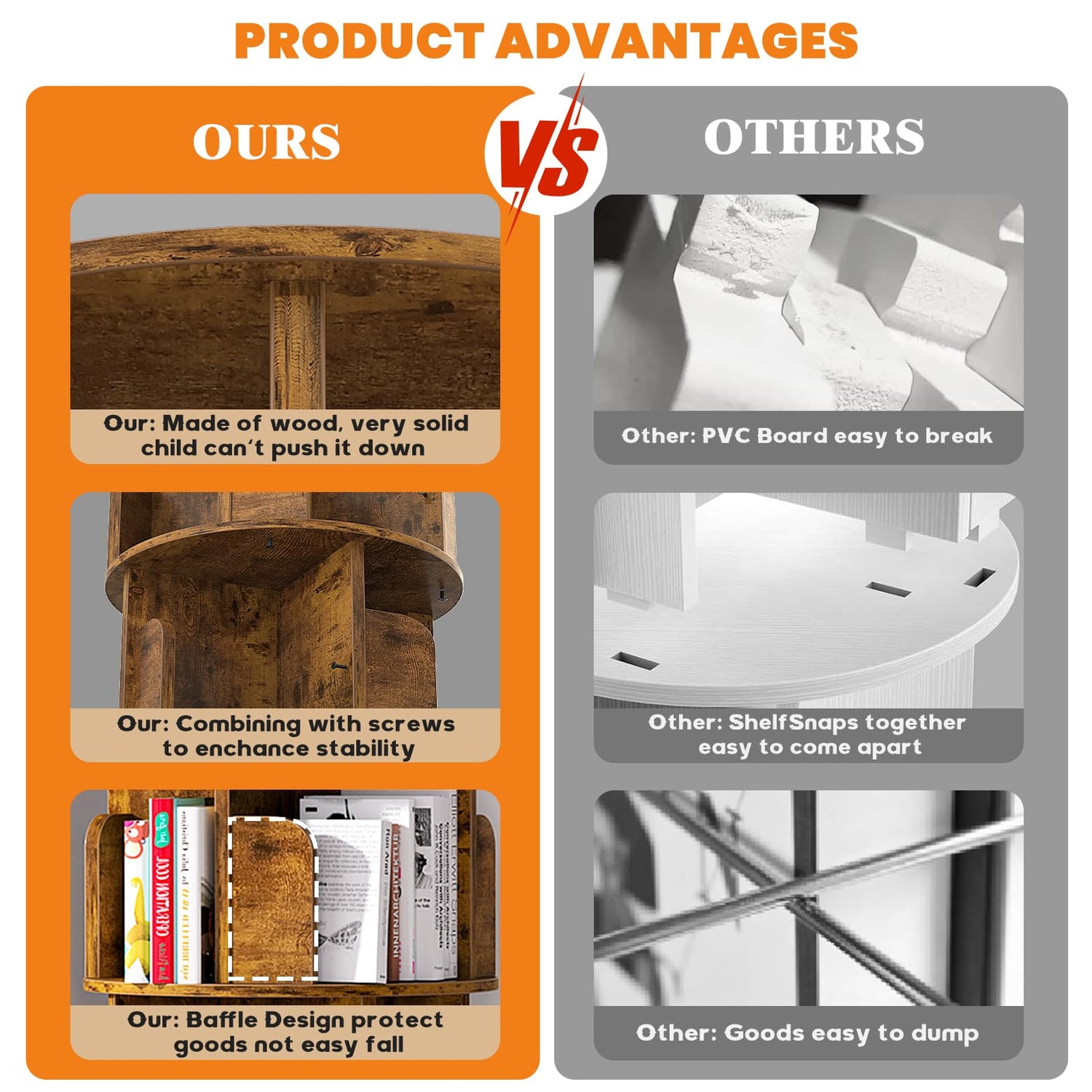 - 【Sturdy 360° Rotating Bookcase】The spinning bookshelf tower is made of high-quality P2 MDF Board, and steel screws fixing that provides great stability and durability, won't tilt or swing easily during the entire rotation. The rotating feature allows for a complete 360-degree display, showcasing your book collection from all angles. it is more stronger, stable, and lasting durable others materials.