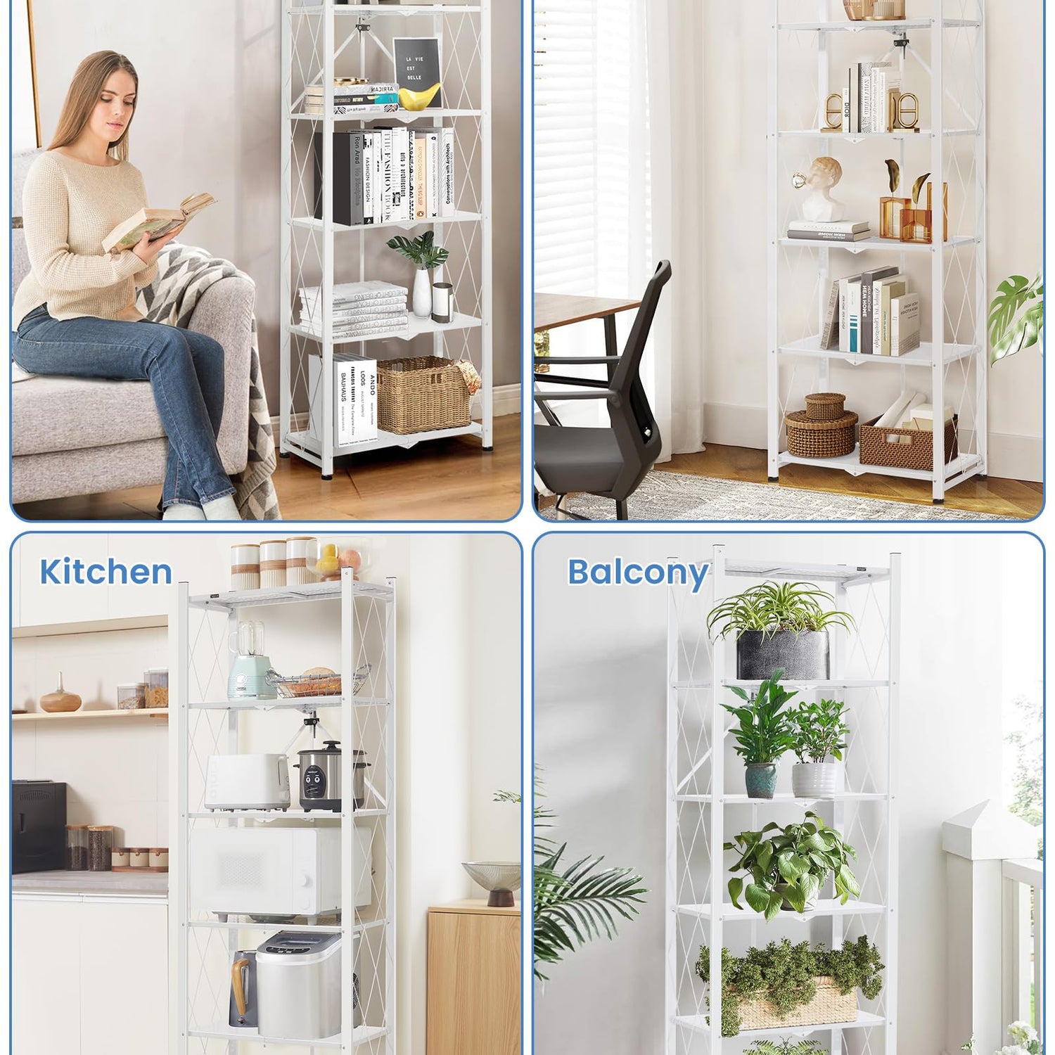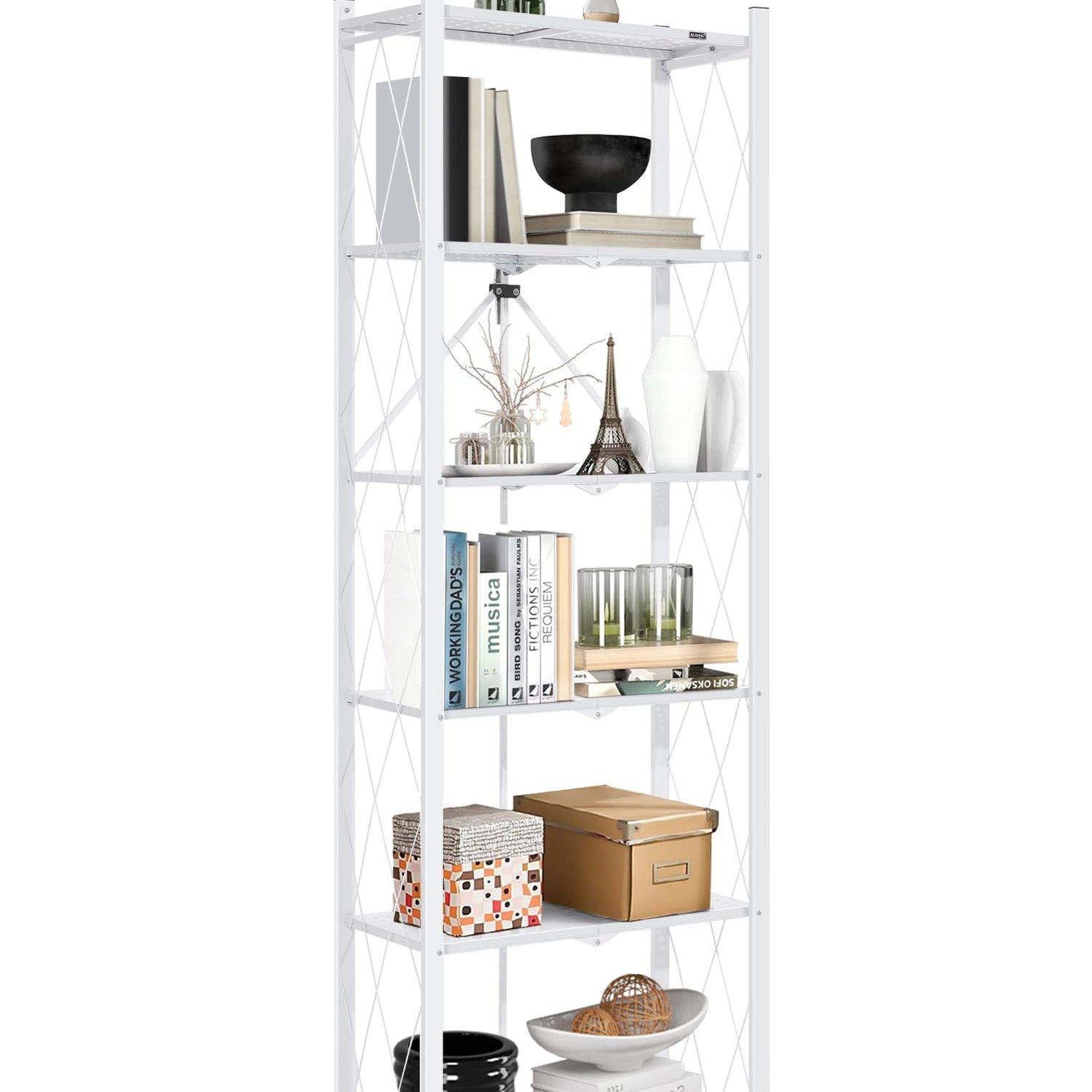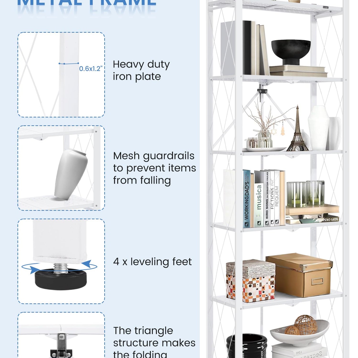 Introducing the ALANNG 70.7-Inch Folding 6-Tier Metal Bookshelf, a perfect combination of style and functionality for your living space. This versatile heavy-duty bookcase is designed to suit any room in your home, including the kitchen, living room, office, and more.