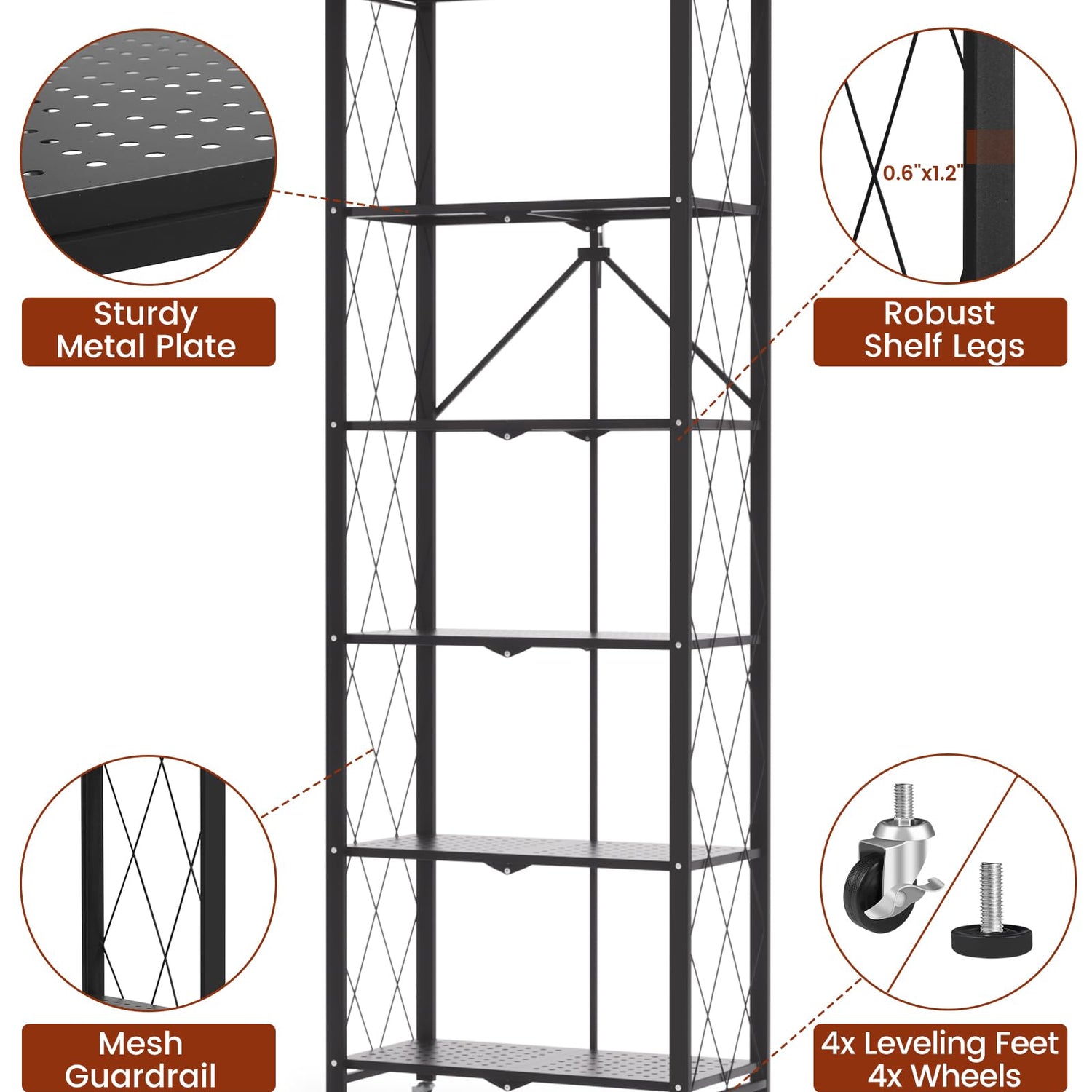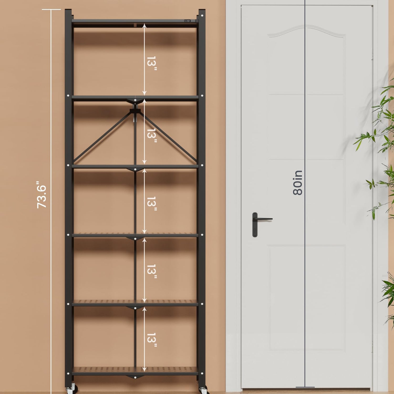 - 6-tier display shelves for bedroom, and living room with 4 leveling feet, unfolded size: 73.6" H x 24.2" W x 11.2" D, folded size: 73.6" H x 3.9" W x 11.2" D