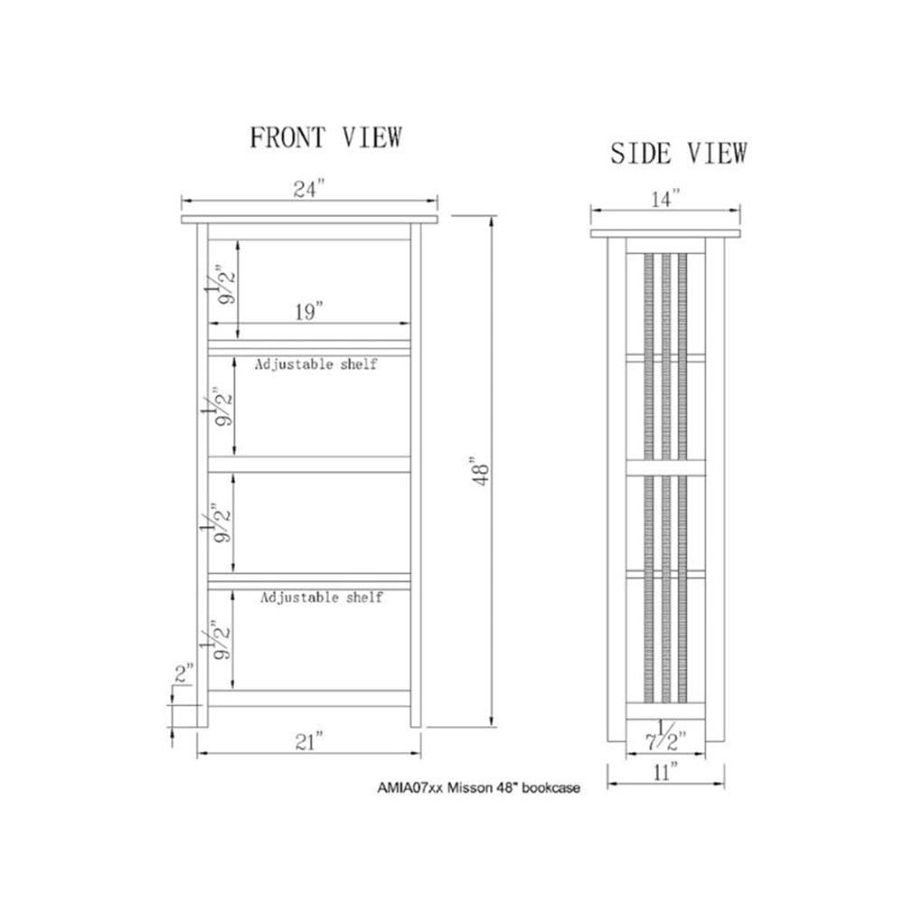 Details: Introducing the Mission 48" H Bookcase with 4 Shelves for your home office or living space. Constructed from wood, composite wood, and wood veneer, this beautiful furniture piece is perfect for storing and displaying books, binders, and your favorite decorations. Designed with two adjustable shelves, it provides ample space for all your items. It also offers a design that fits with any decorating style and is perfect for adding that extra touch of style to your space. With dimensions of 27" W x 16" D x 48" H and shelves being 19" W x 10.75" D, this bookcase provides enough storage for all the items you need in your home. Wipe it down with a dry cloth for easy cleaning, and some assembly is required. This Mission style bookcase is the perfect way to add some extra storage or display space, with the convenience of its sleek and modern design. Get yours today and make the most of your living or office space with the Mission 48" H Bookcase with 4 Shelves.