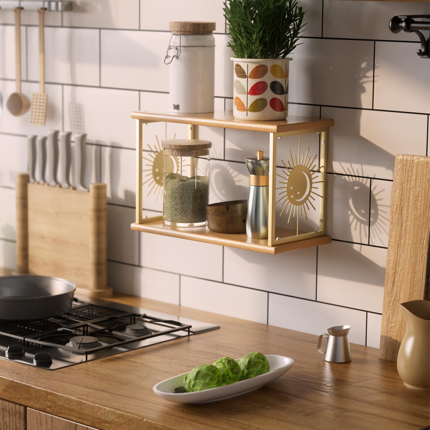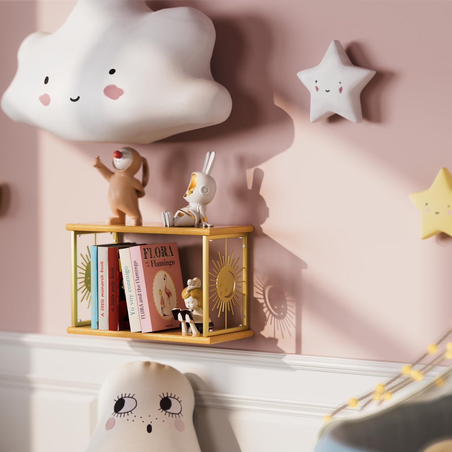 The Floating Nightstand features a captivating celestial design, inspired by astrology, that includes intricate depictions of the sun, moon, and stars. It is more than just a bedside table; it serves as a perfect wall shelf, allowing you to display your cherished items such as crystals, stones, toys, or anything else that holds significance for you.