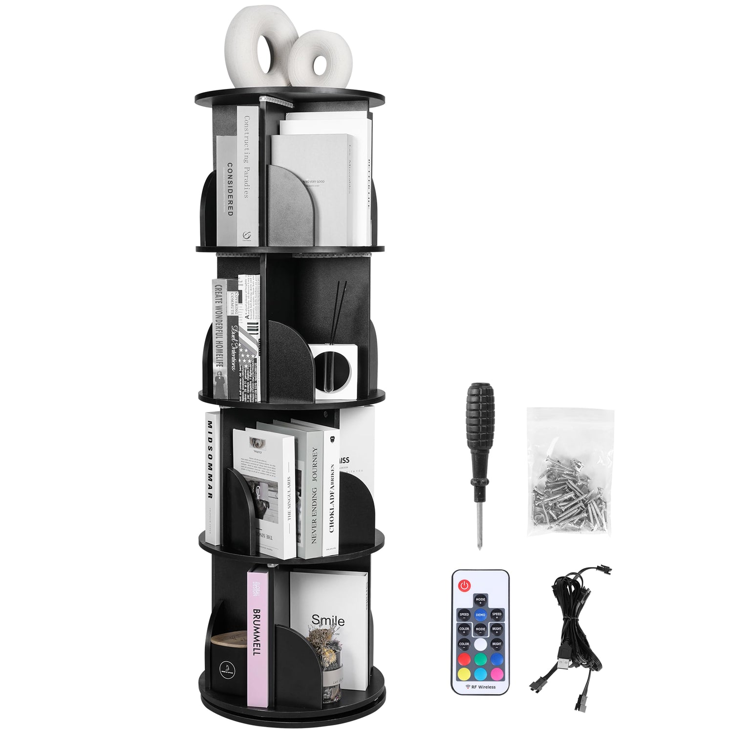 - ⚫Illuminate with Style: Transform your space with our bookshelf organizer, featuring integrated RGB LED lights. Customize your lighting with the included remote control. ⚫Effortless 360° Access: Our innovative design allows for smooth, 360° rotation, ensuring you can easily access your books and items from any angle. Ideal for maximizing space in any room, particularly in corner bookshelves arrangements. ⚫Spacious and Sleek: With a capacity to hold 60-100 books, this 4-tier small space bookshelf combines ample storage with a modern, sleek design. ⚫Built for Durability and Safety