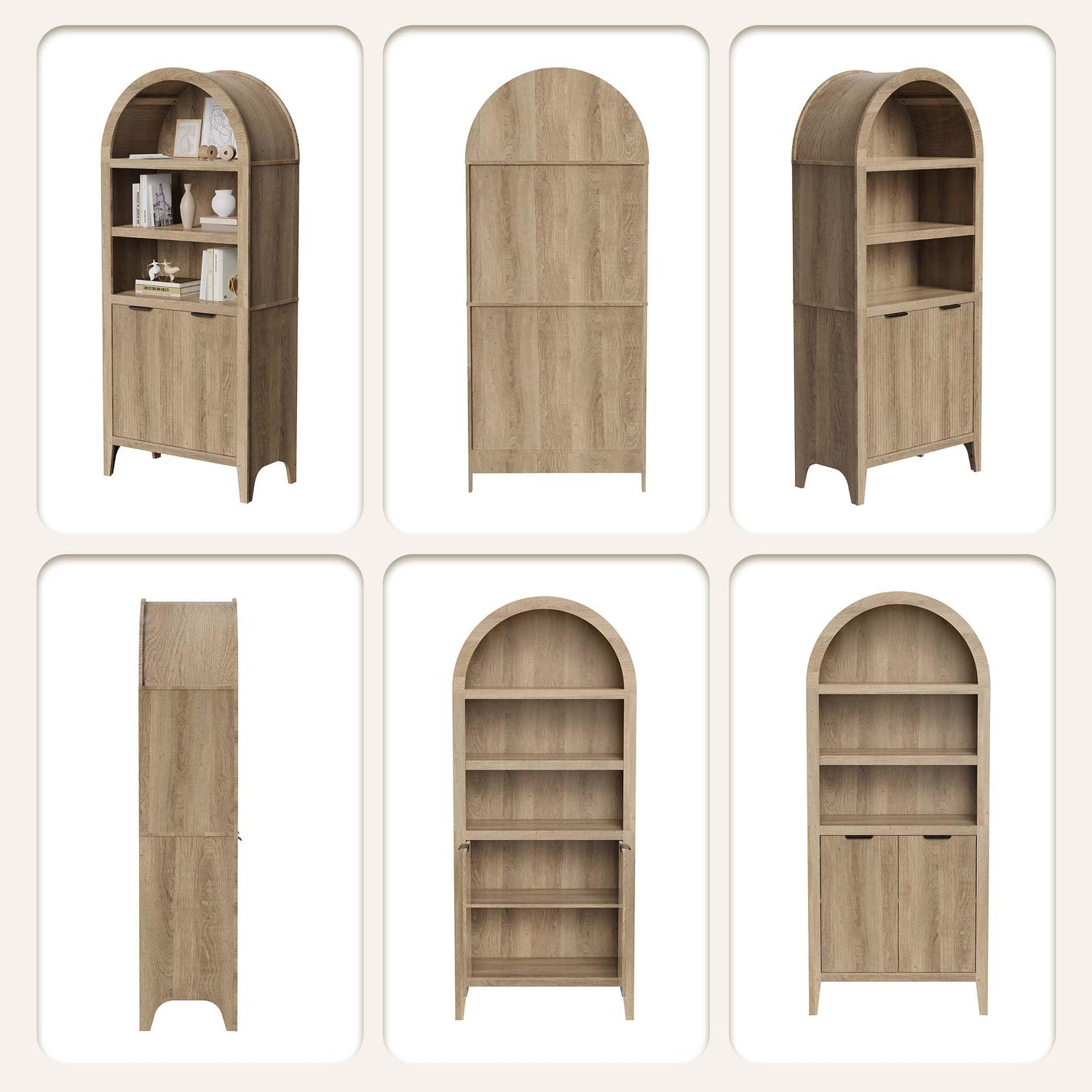 - Enough Storage Space: This arched storage cabinet offers a functional and stylish solution for your various needs. The bottom half includes two-door cabinet with metal handles and adjustable shelves, perfect for storing kitchen essentials, office supplies or personal items. The upper part has a 3-level open arched bookshelf, 2 shelves can be adjustable, which allow you to arrange items of various sizes, maintaining a well-organized and visually appealing appearance.