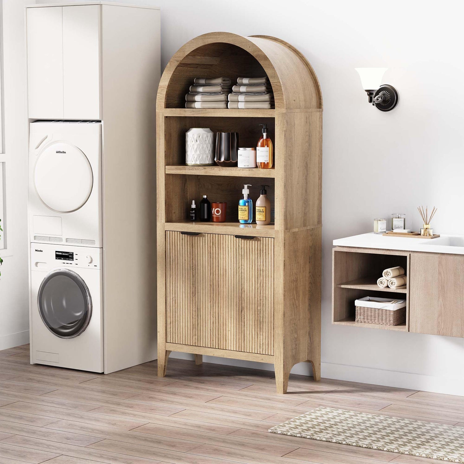 blini Arched Cabinet Bookshelf Arch Bookcase with Doors, Wooden Oak Curved Book Case 5-Tier Tall Round Top Bookshelves for Living Room
