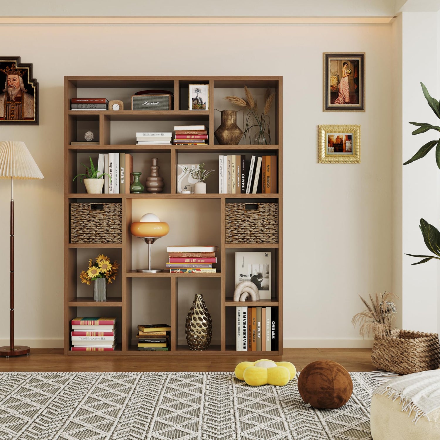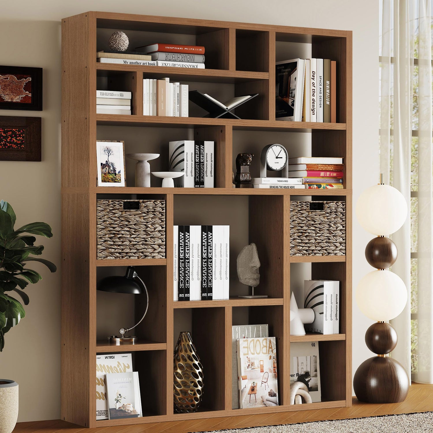 - Smart Storage Solution – The unique backless design with 16 irregularly arranged cubes (6 tiers total) offers versatile storage options, perfect for books, decor, and the included 2 premium foldable woven baskets that add both functionality and style.