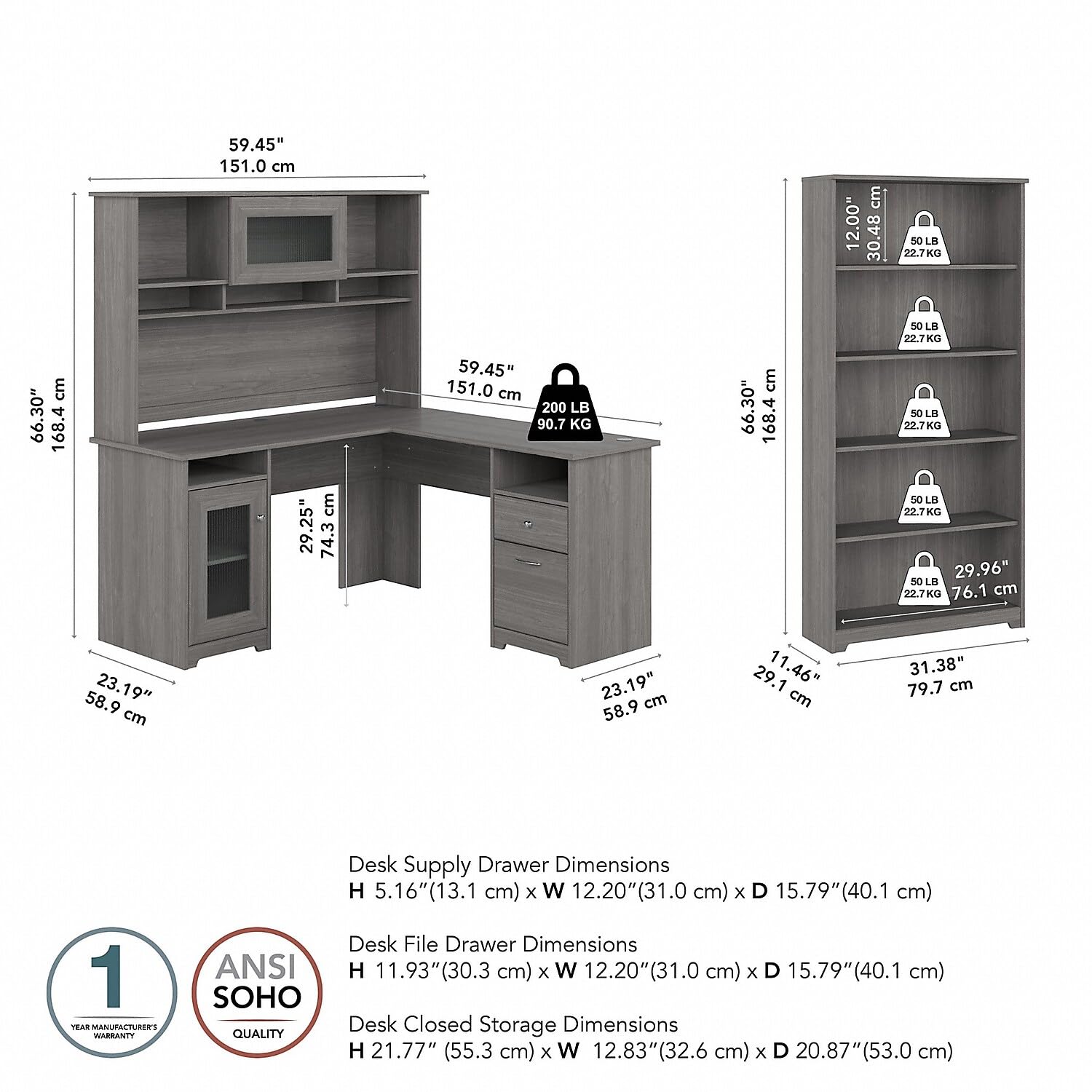 Dimensions of the desk measure 59.45" W x 59.45" L x 66.30" H, providing generous space without overwhelming your room. The combination of stylish storage options makes the Bush Furniture Cabot Collection L Shaped Desk with Drawers, Hutch, and Bookcase an excellent choice for those seeking a professional yet personal touch in their environment.