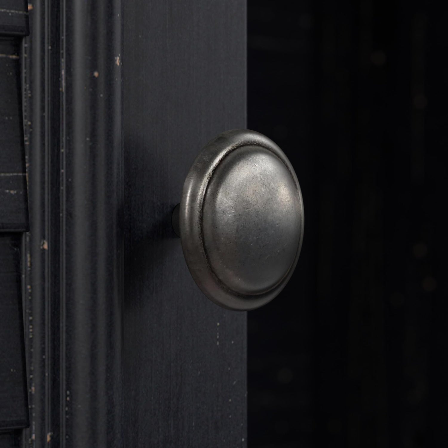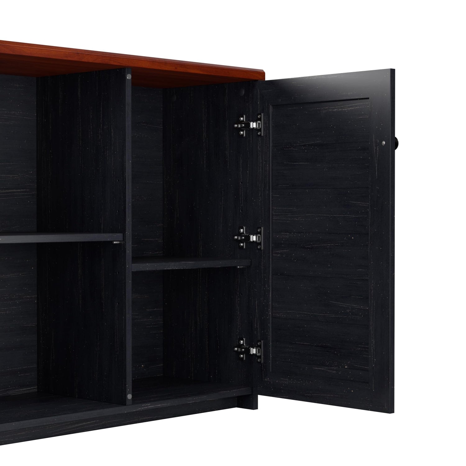 This charming cabinet showcases a unique style with its antique black finish and Hansen cherry accents, complemented by antique pewter hardware that adds a subtle touch of farmhouse elegance.