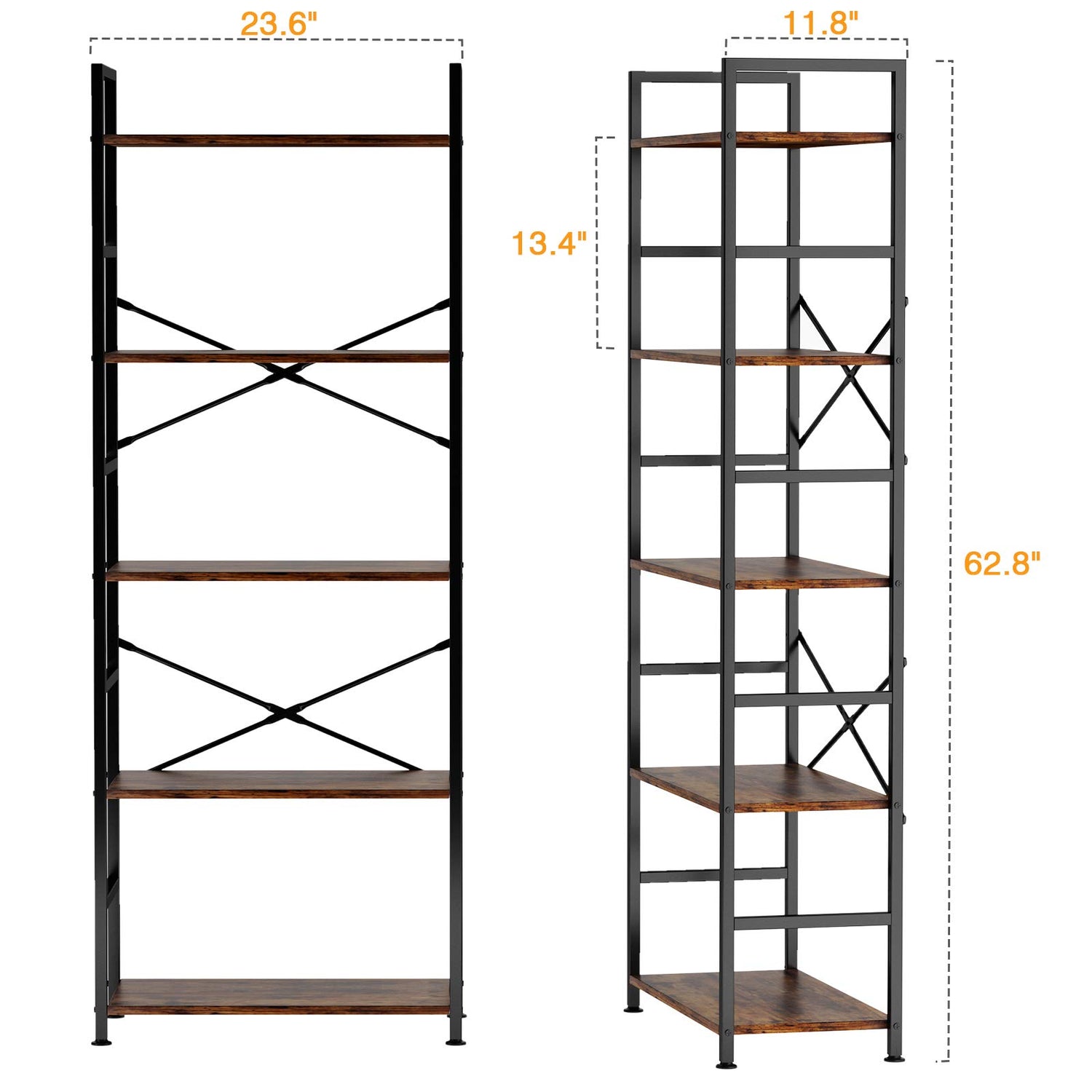 - 【SUPER STURDY CONSTRUCTION】Each shelf can hold up to 80 lbs. Heavy metal frame with X-frame backing enhances the stability of this bookshelf. Adjustable leg pads in the bottom prevent wobbling from uneven floor.