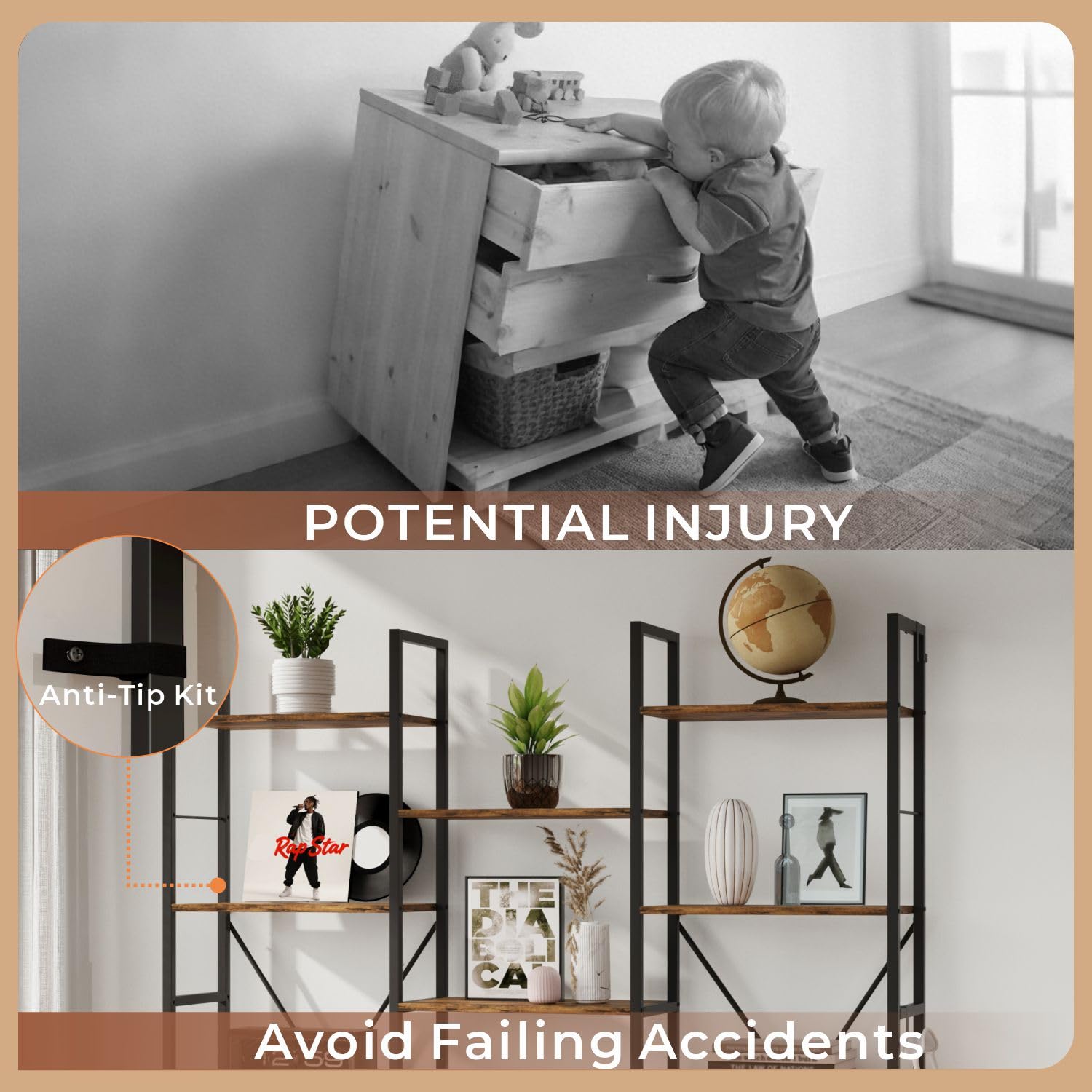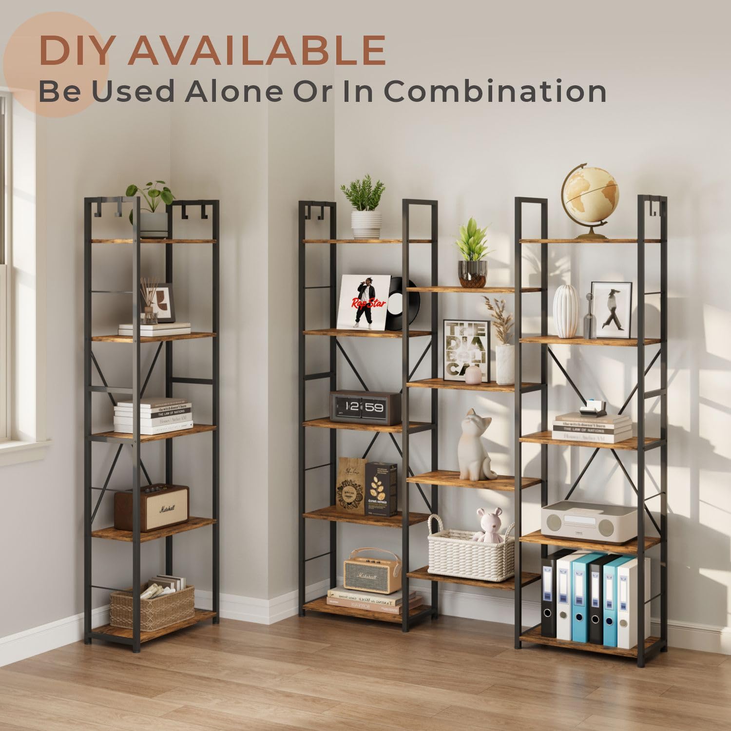 DSNAPE Triple Wide 5 Tier Bookshelf, 67" H Tall Industrial Bookcase with 14 Open Book Shelves, 4 Bonus Hooks and Adjustable Feet, Large Display Storage for Living Room, Office, Rustic Brown