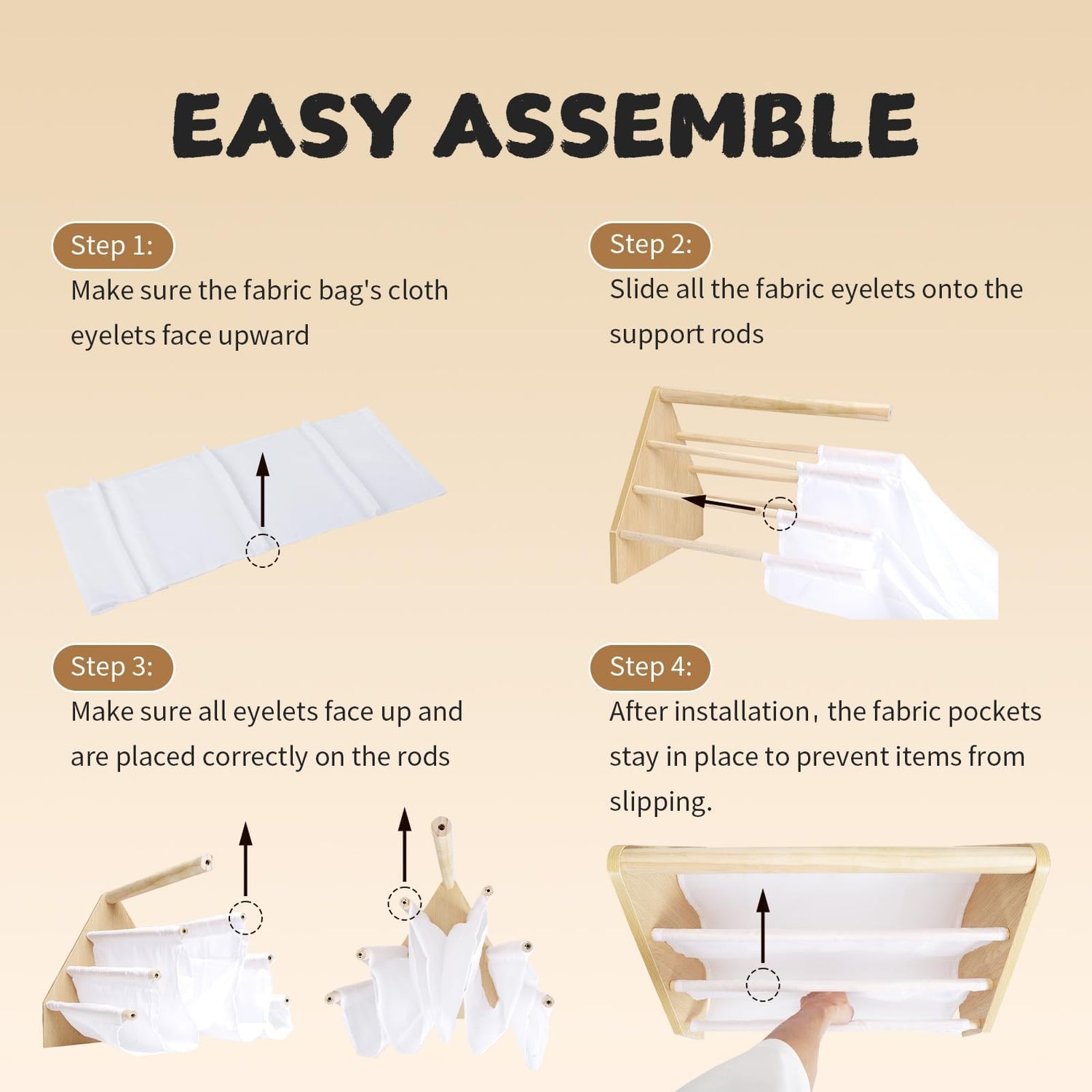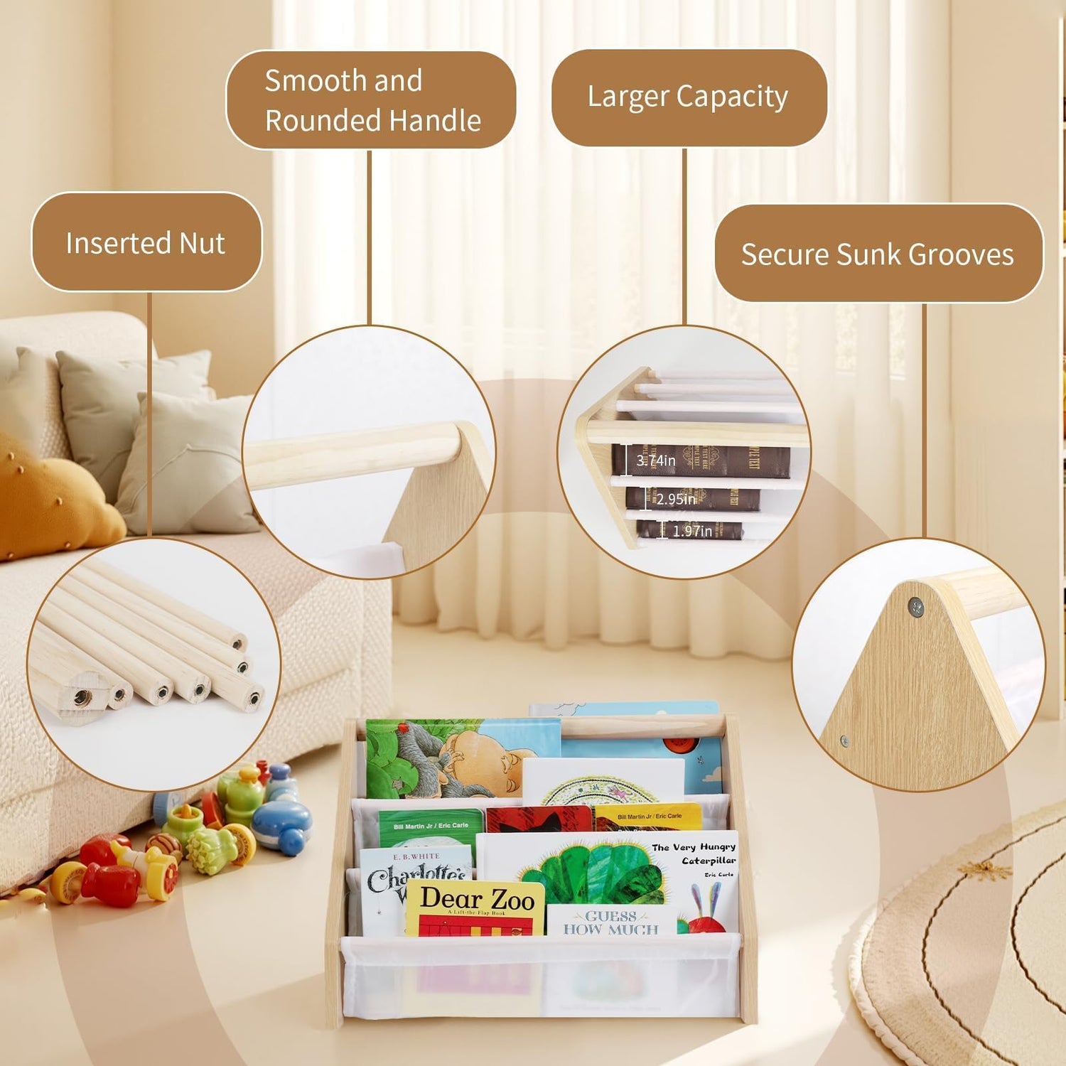 • Easy Setup & Maintenance: This kids bookshelf comes with clear instructions, rods, and bolts for quick assembly. Made from sturdy, easy-to-clean wood and wipeable fabric pockets—ideal for parents and teachers to create a tidy, loving reading space. Tip: For best stability, install the fabric pockets with the support strips facing upward to prevent books from wobbling or sliding, keeping the nursery bookshelf neat and easy for toddlers to access.