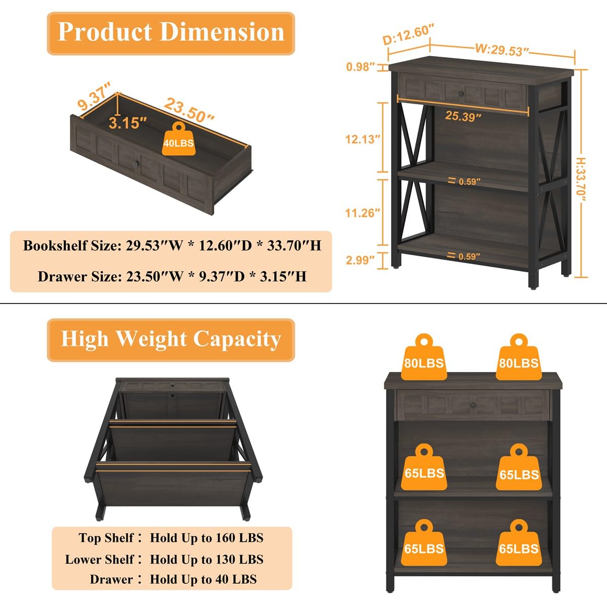 - [3 Tier Bookshelf with Drawer] This versatile bookcase not only functions as a place to store your books but also features a convenient drawer for tidily organizing smaller items. It offers an ideal solution to maintain a clean, organized, and easily accessible room. The minimalist design ensures it seamlessly fits into various spaces, be it the living room, entryway, or office. Effectively conceal clutter while infusing your space with a touch of rustic farm charm