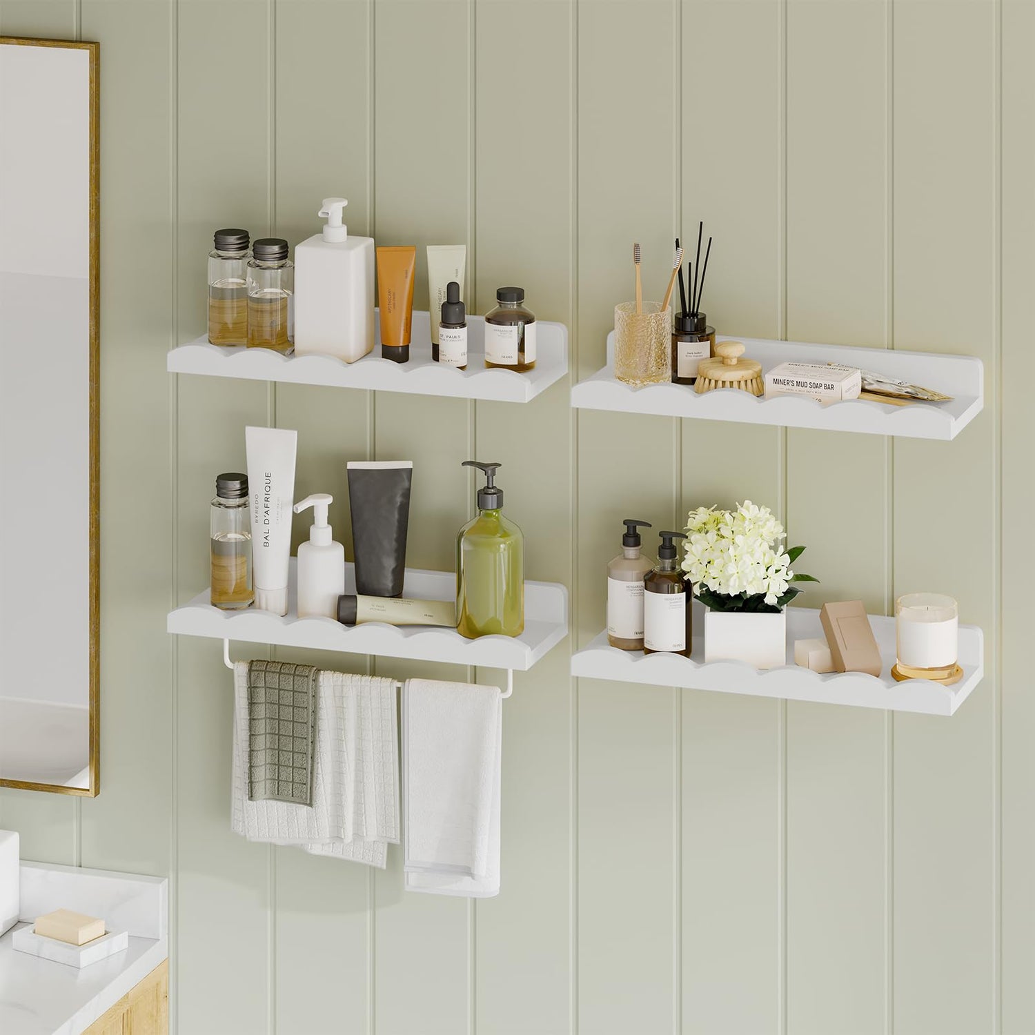 Fixwal Nursery Shelves, 16.5 Inch Floating Bookshelves for Wall Set of 4, Scalloped Wall Book Shelves with Towel Rack for Kids, Toddler Room, Baby Room, Nursery Decor and Storage(White)