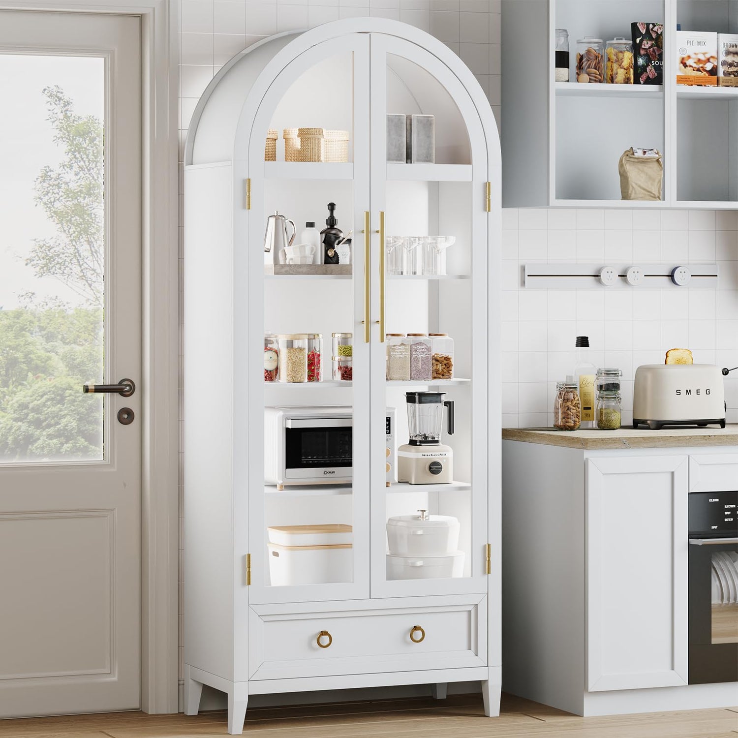 - 【Unique Design】Arched Cabintes design with transparent tempered glass door adds a stylish touch to your home decor