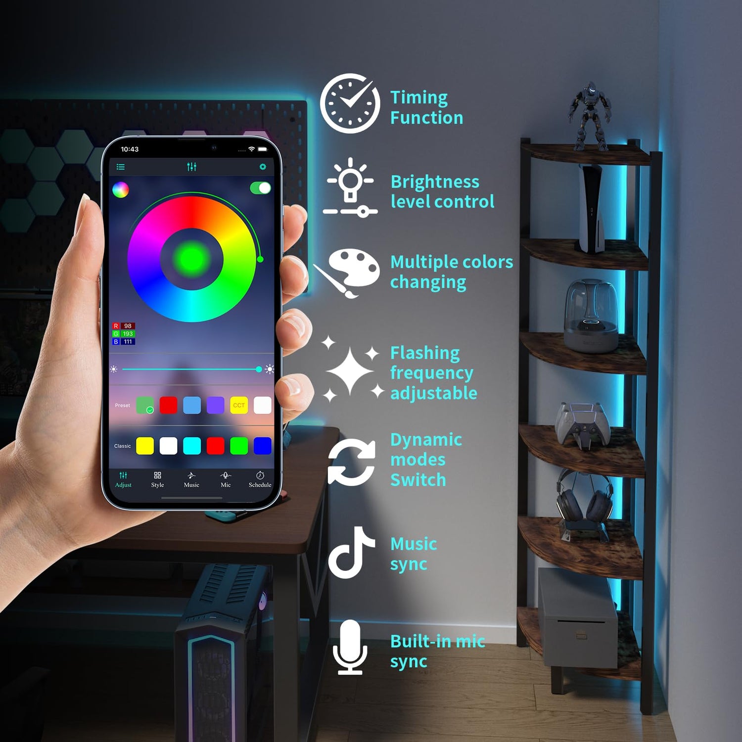 • 3 Control Methods: This corner shelf light strip easily manage your light bars with the APP, remote control or control box,Customize the exact light you want , Control segmented color and brightness.Also, you can DIY color, set up music sync and scene mode.