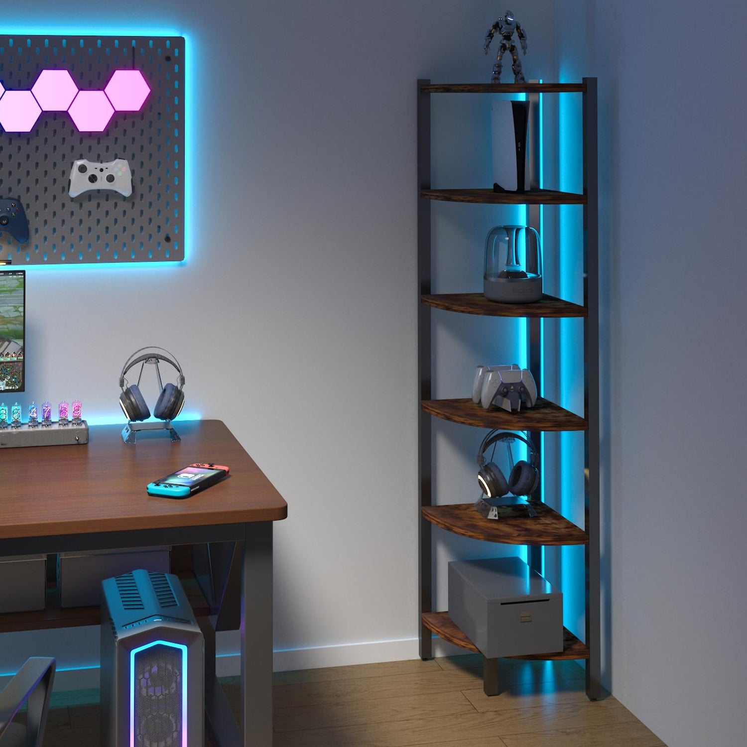 HONGOUZWL Corner Shelf with LED Lights, 6-Tier Corner Bookshelf, 66'' Organizer Book Shelf Shelves Steel Frame Display Stand with Living Room, Bedroom, Study, Rustic Brown