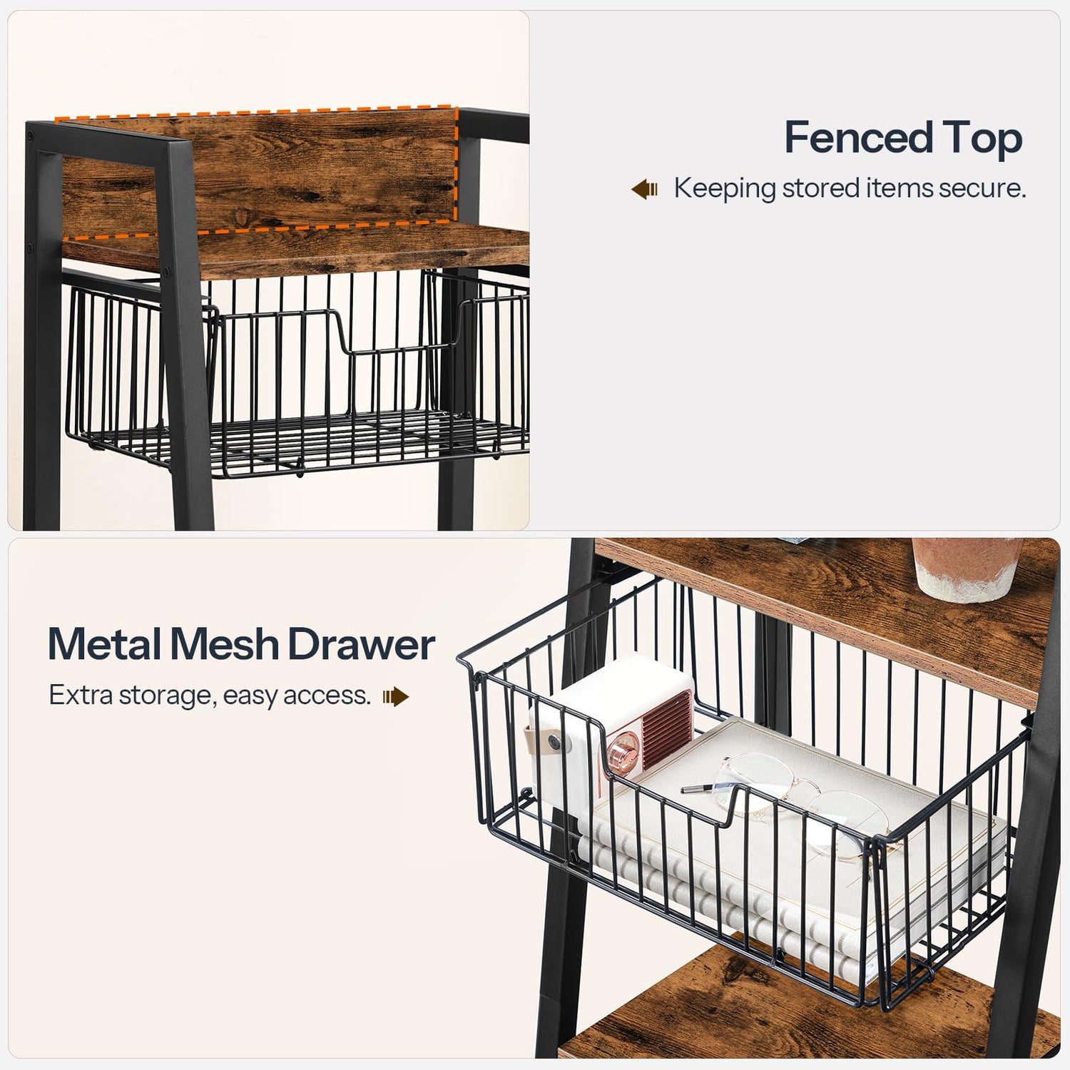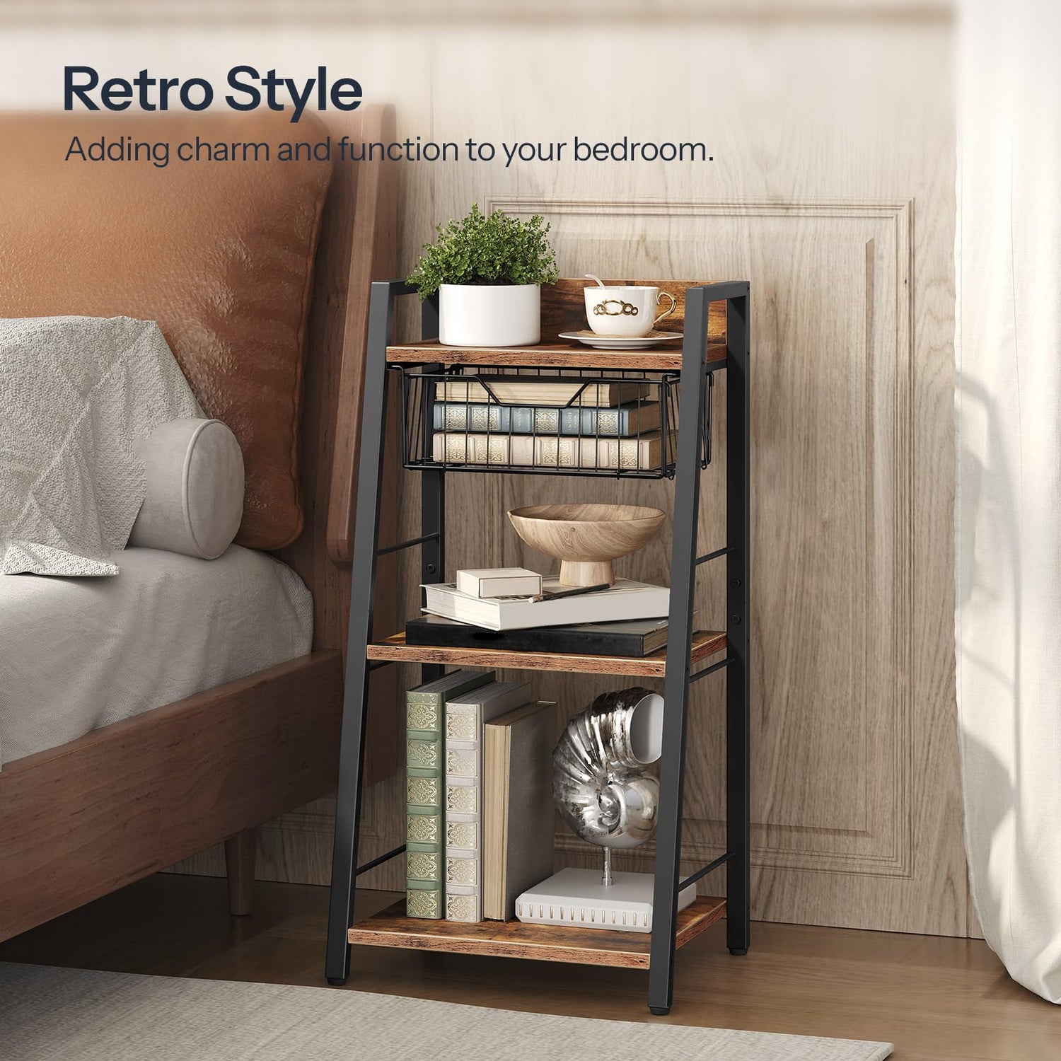 - Vintage Industrial Style: This shelving unit showcases a black metal structure paired with vintage-hued panels. Its minimalist design and timeless color scheme bring an industrial appeal to your bedroom or living area, elevating your home taste