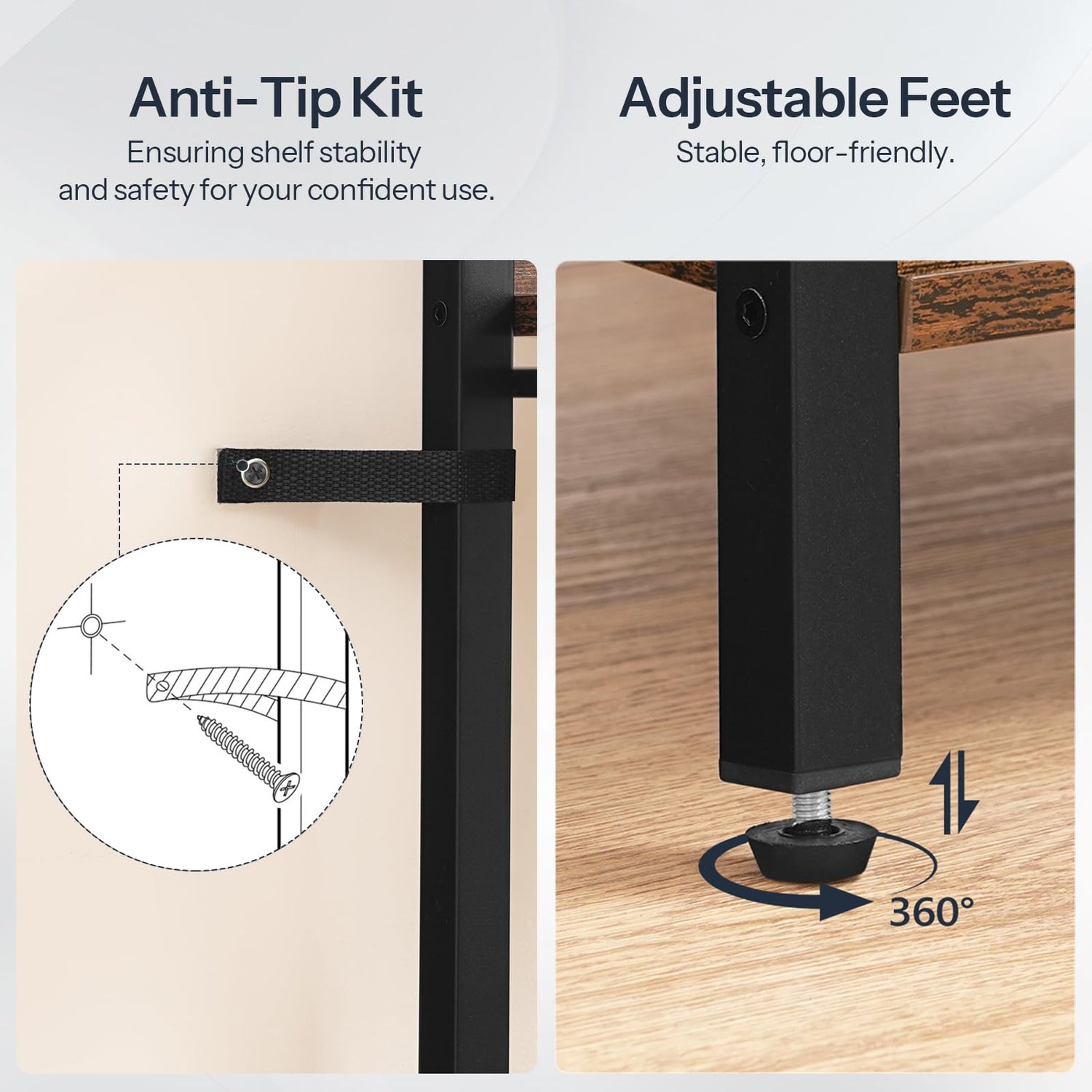- Sturdy and Enduring: Crafted from premium particleboard and metal tubing, this bookshelf boasts a solid structure with refined craftsmanship. Reinforced by 4 adjustable feet and an anti-tip kit, it ensures stability and peace of mind in every use