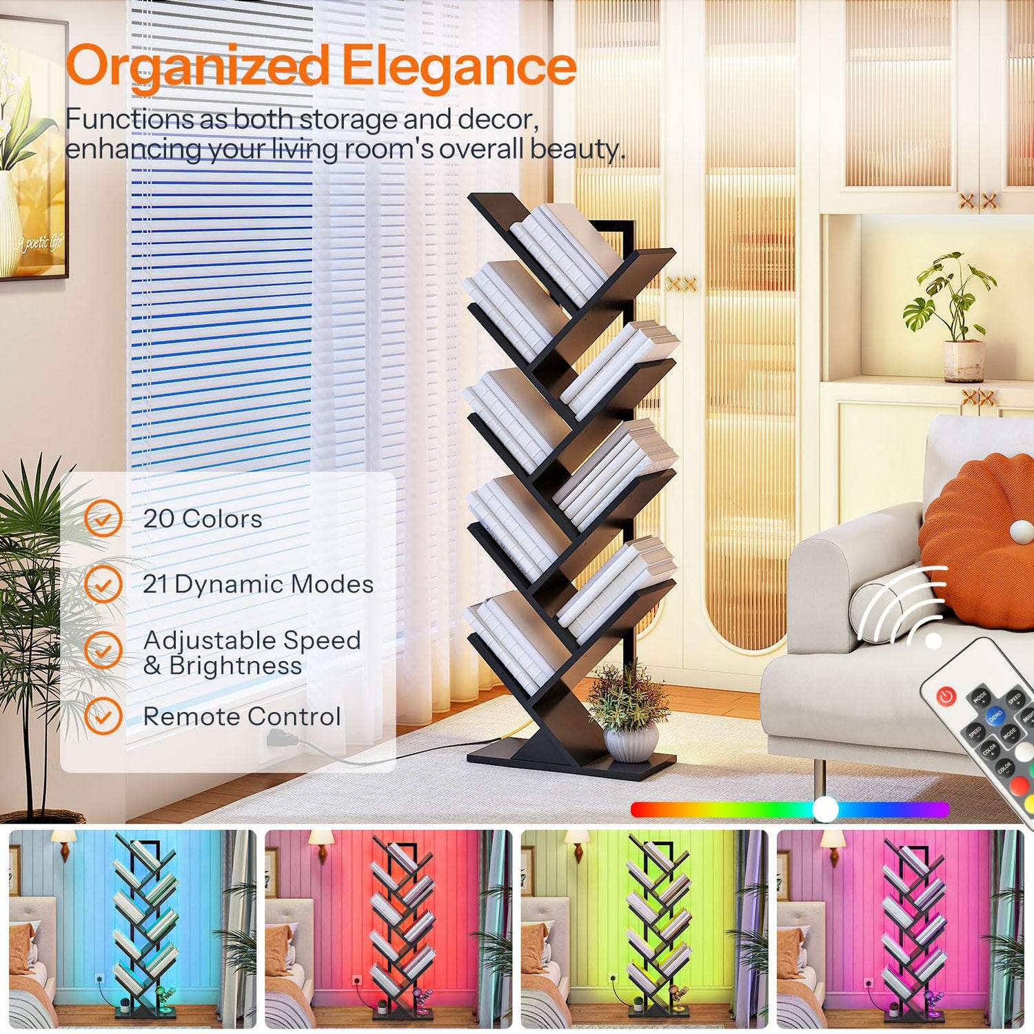 - Customizable Lighting, Create Your Mood: This tree-shaped bookshelf has an RGB light strip that can be adjusted to 8 brightness levels and 21 dynamic modes. Easily set the right ambiance for reading, entertaining, or relaxing, right from your remote