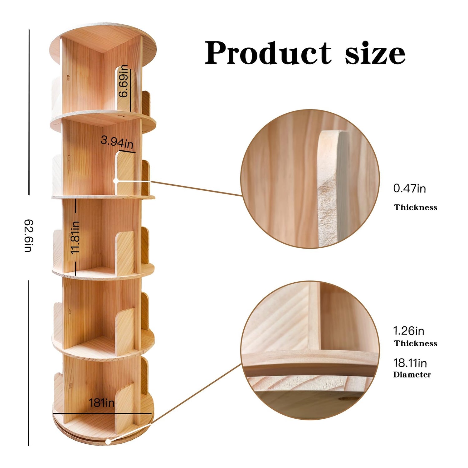 - Large size: 5 tier of revolving bookcase with a total height of 63 inches, a diameter of 18 inches, and a height of 11.8 inches for each layer of bookshelf, The larger size allows you to store more books and items, making it highly practical