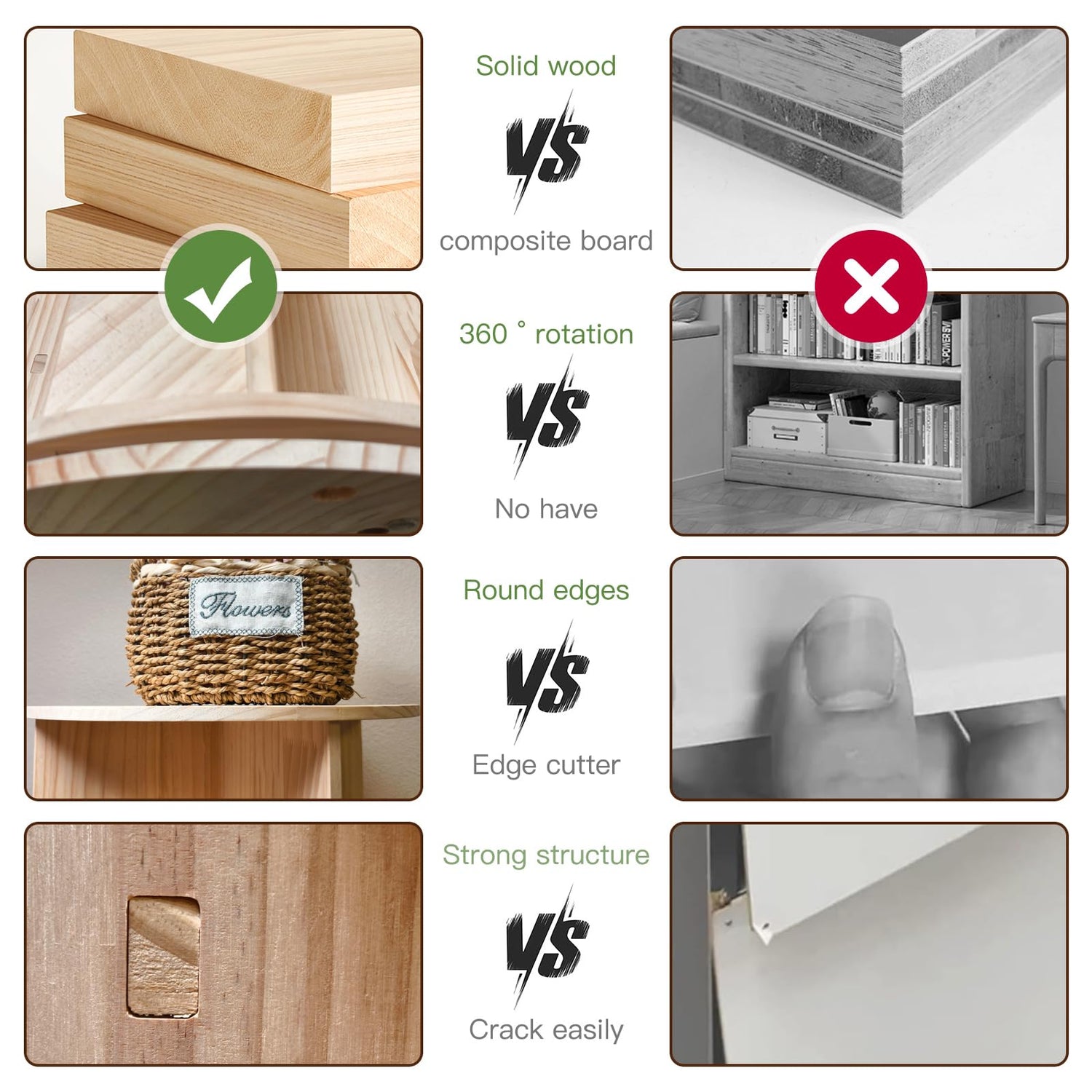 - Solid wood:The rotating bookshelf tower is made of 12mm thick pure solid wood, which is strong and durable, no glue, no odor, no paint, and has a beautiful appearance