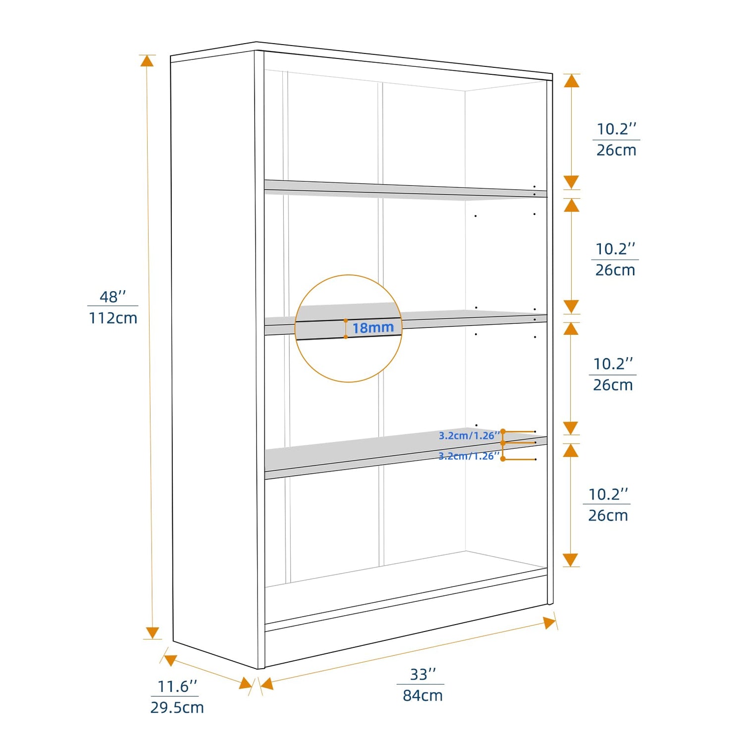 • Spacious & Adjustable Design:This book shelves dimensions[1.6" (D) x 33" (W) x 48" (H)].4-tier bookshelf with 3 adjustable shelves to customize storage for books, bins, vases, or photo frames.