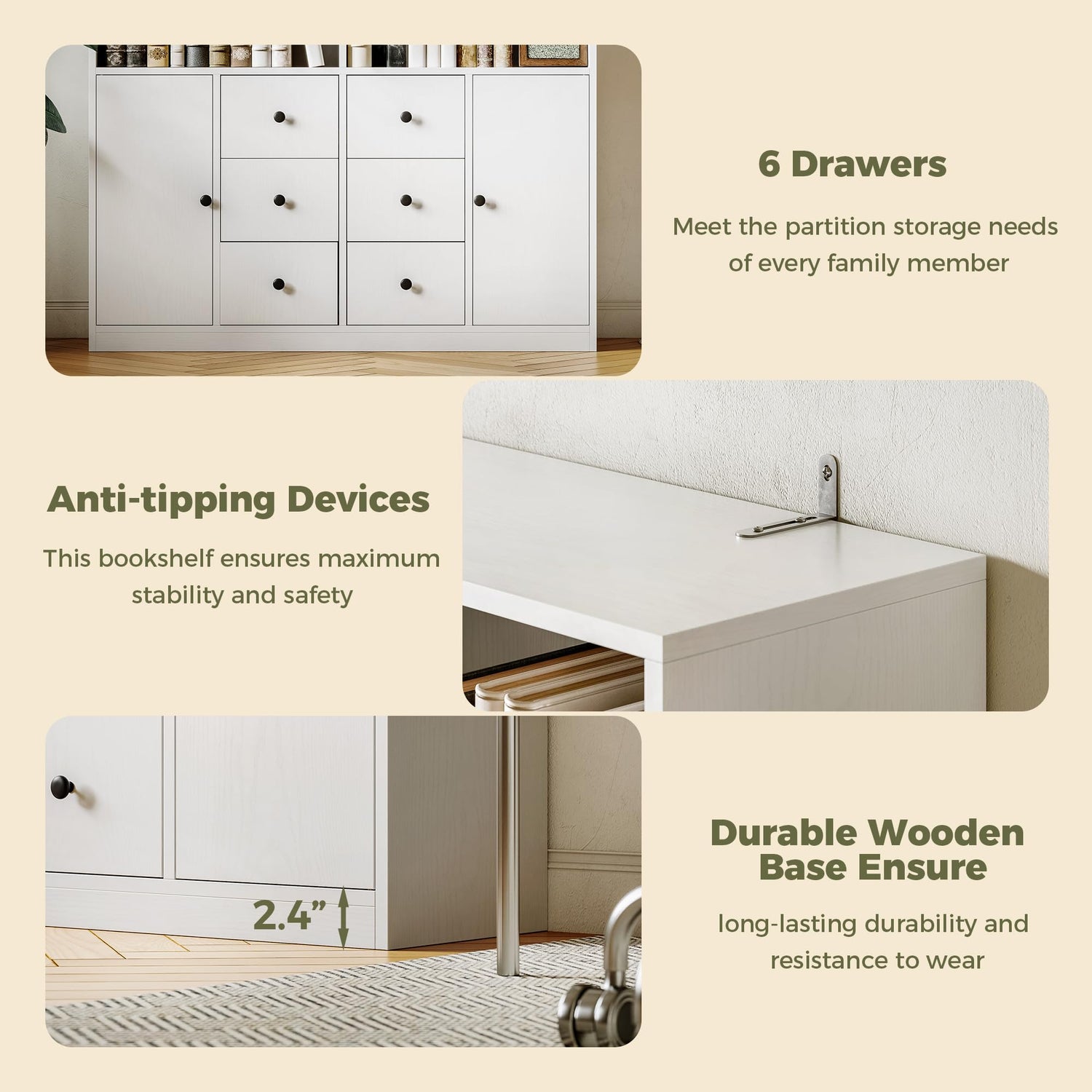 - Six Drawers and Two Doors: Bookcases with drawers and doors with 2 adjustable shelves can help you realise partitioned storage, the perfect combination of home display and storage, making work and life more in tune